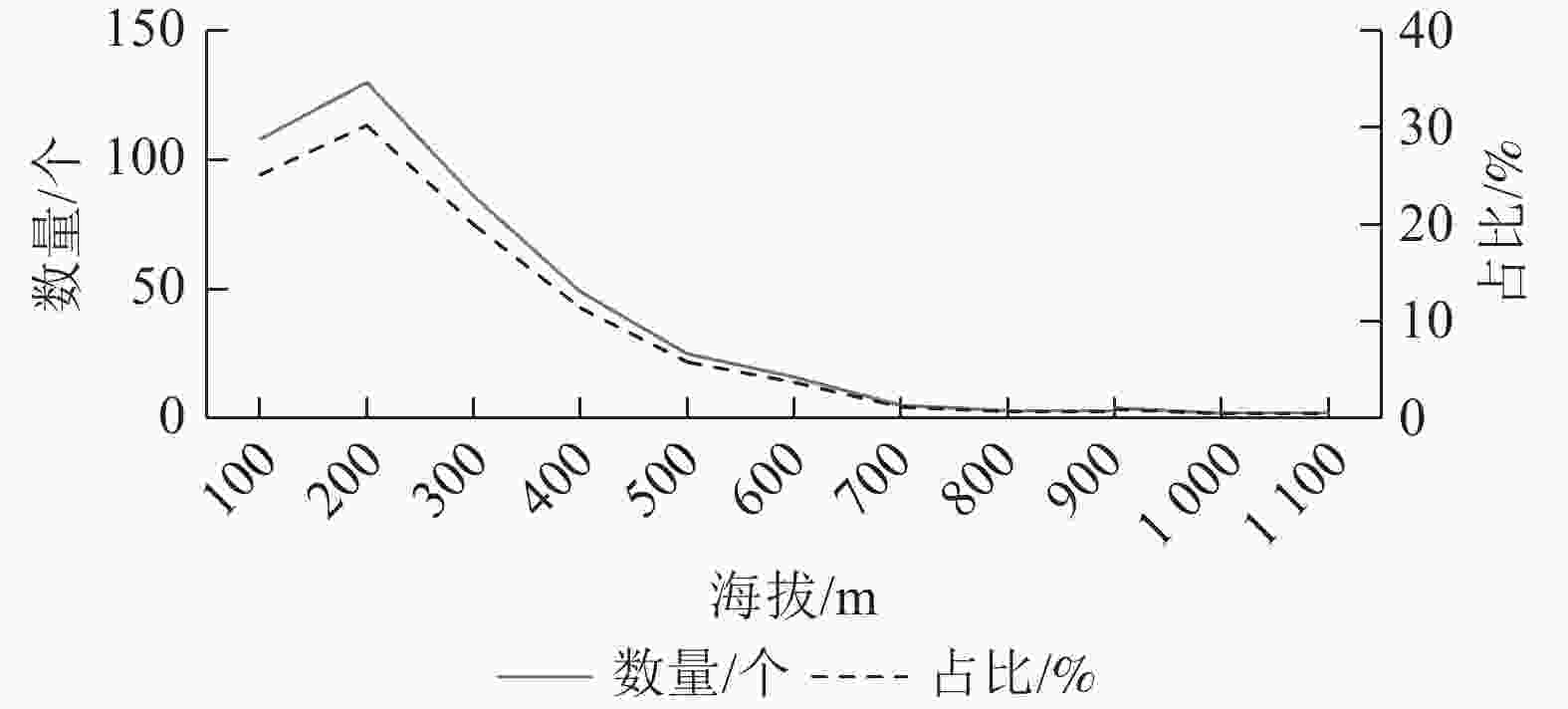 由图3可见:①江西省国家森林乡村整体具有“低地指向性”。江西省430个国家森林乡村平均海拔约225 m,较江西省246 m的平均海拔低21 m。其中,0~200 m的森林乡村数量最多,达238个(55.35%);200 m以上数量持续减少。②不同区域国家森林乡村的平均海拔低于区域平均海拔,也具有“低地指向性”。其中,赣北、赣中、赣南地区国家森林乡村平均海拔分别为188、228、313 m,分别较赣北、赣中、赣南地区186、249、365 m的区域平均海拔低2、21、52 m,这与江西自北向南逐渐抬升的地势一致[19]。