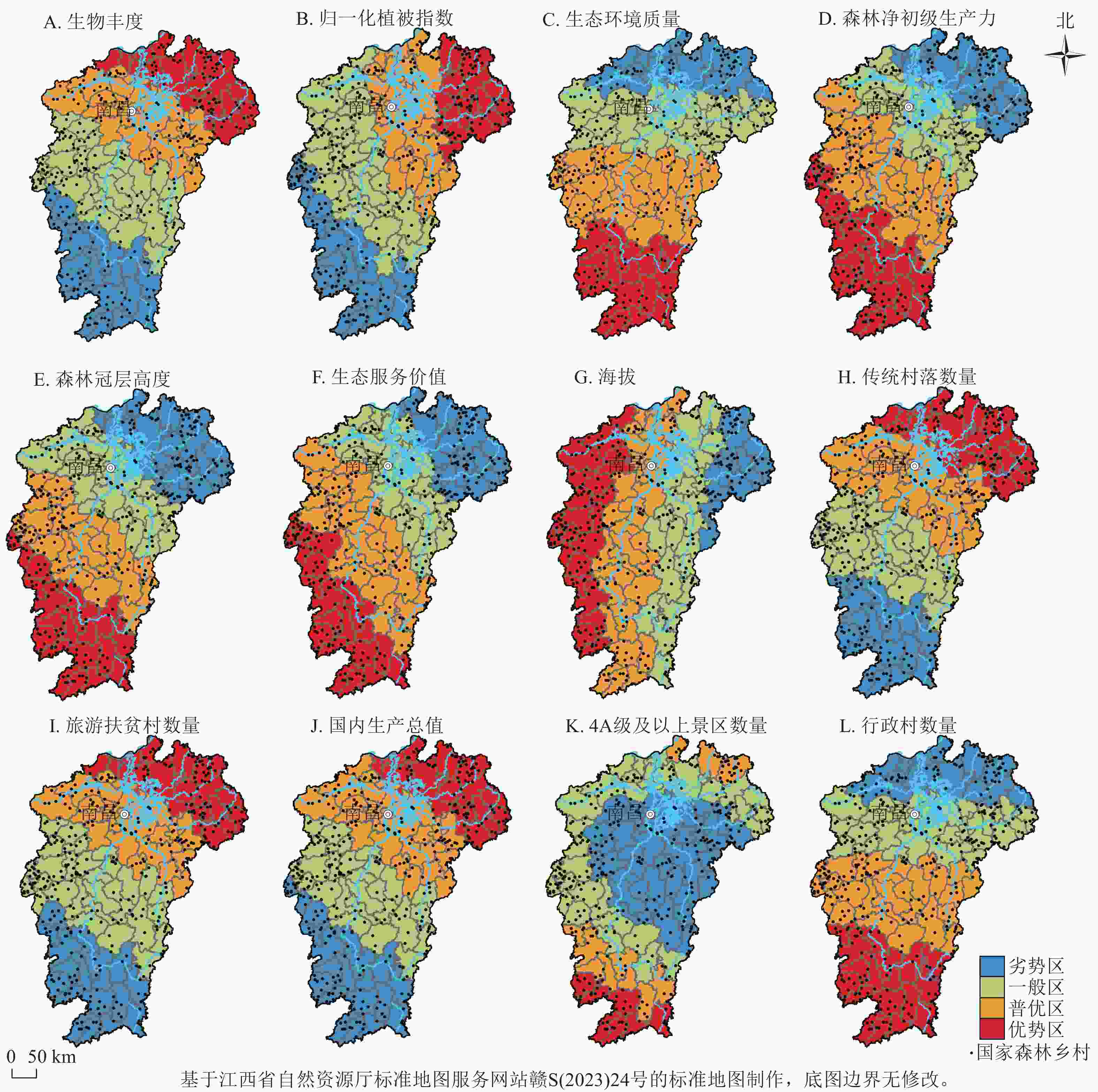 筛选q>0.25的评价指标进一步参与地理加权回归分析,使用ArcGIS 10.7的自然断裂法,将各项评价指标的回归系数划分为优势区、普优区、一般区、劣势区等4级。从空间格局看,主要影响因素的优势区基本分布在省界边缘地带,特别是赣北—赣东北或赣南—赣西南地区。优势区意味着该因素在该区域具有相对较高的影响力,而劣势区则相反。具体而言,在自然环境因素中,生物丰度(图4A)、归一化植被指数(图4B)优势区均位于赣北—赣东北地区;生态环境质量(图4C)、森林净初级生产力(图4D)、森林冠层高度(图4E)、生态系统服务价值(图4F)指标优势区均位于赣南—赣西南地区。此外,只有海拔(图4G)的优势区位于赣西地区,这里为罗霄山脉、幕阜山脉等中低山区。社会环境因素中,传统村落数量(图4H)、旅游扶贫村数量(图4I)、国内生产总值(图4J)优势区均位于赣北—赣东北地区;4A级及以上景区数量(图4K)、行政村数量(图4L)优势区均位于赣南—赣西南地区。主要影响因素对国家森林乡村空间格局的形成兼具正负效应,存在全部正值、全部负值和负值转正值3种状态。以生态环境质量为例,回归系数为正值,且自西南向东北呈层状递减,表明生态环境质量对国家森林乡村具有正效应(图4C)。以国内生产总值为例,回归系数为负值,且自东北向西南递减,表明国内生产总值指标对国家森林乡村具有负效应,同样直接印证了江西省国家森林乡村偏离经济中心的经济格局(图4J)。