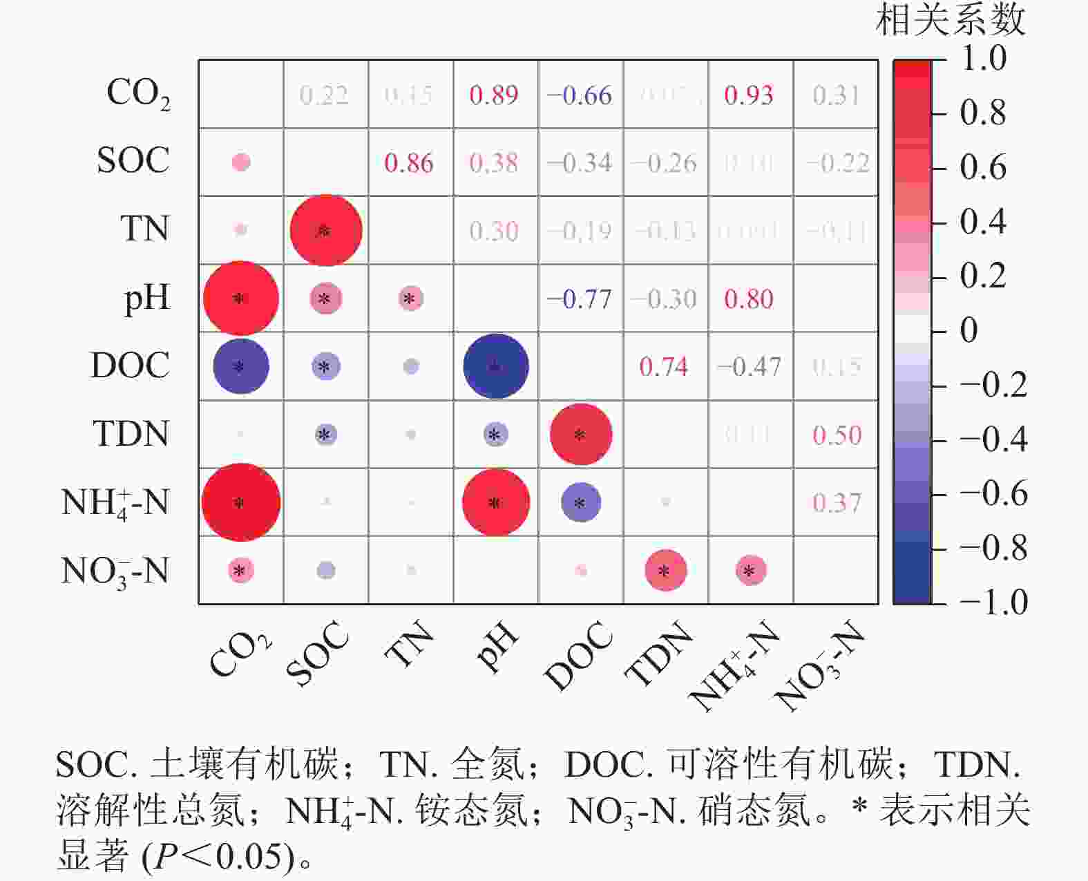 相关分析(图3)发现:土壤CO2排放量与土壤pH、铵态氮、硝态氮呈显著正相关(P<0.05),与有机碳、全氮、溶解性总氮不存在相关性。