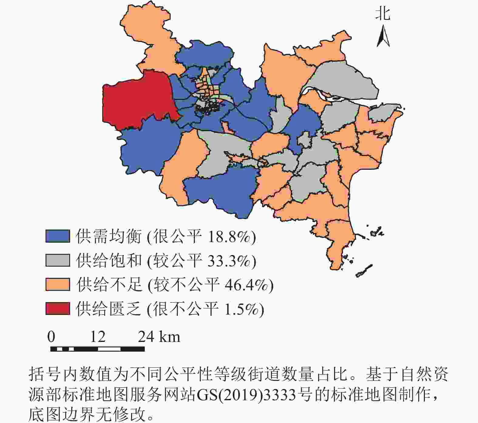 基于可达性分级结果与各群体需求指数,将研究区各街道划分为4类:①ISD≥0.3且$ {A}_{i} $≥5,为高需求高可达性区域;②ISD<0.3且$ {A}_{i} $≥5,为低需求高可达性区域;③ISD<0.3且$ {A}_{i} $<5,为低需求低可达性区域;④ISD≥0.3且$ {A}_{i} $<5,为高需求低可达性区域。为进一步衡量公园绿地分布的公平性,根据如下假设建立供需指数与空间公平性的关系:①高需求高可达性区域能够很好实现供给与需求之间的平衡,达到供需均衡,在公平性上表现为很公平;②低需求高可达性区域能较好实现供给与需求之间的平衡,但仍是供给大于需求的供给饱和状态,表现为较公平;③低需求低可达性区域需求量低,但由于供给太低未能实现供给与需求之间的平衡,供给不足表现为较不公平;④高需求低可达性区域供给量远低于需求量,供给匮乏表现为很不公平。