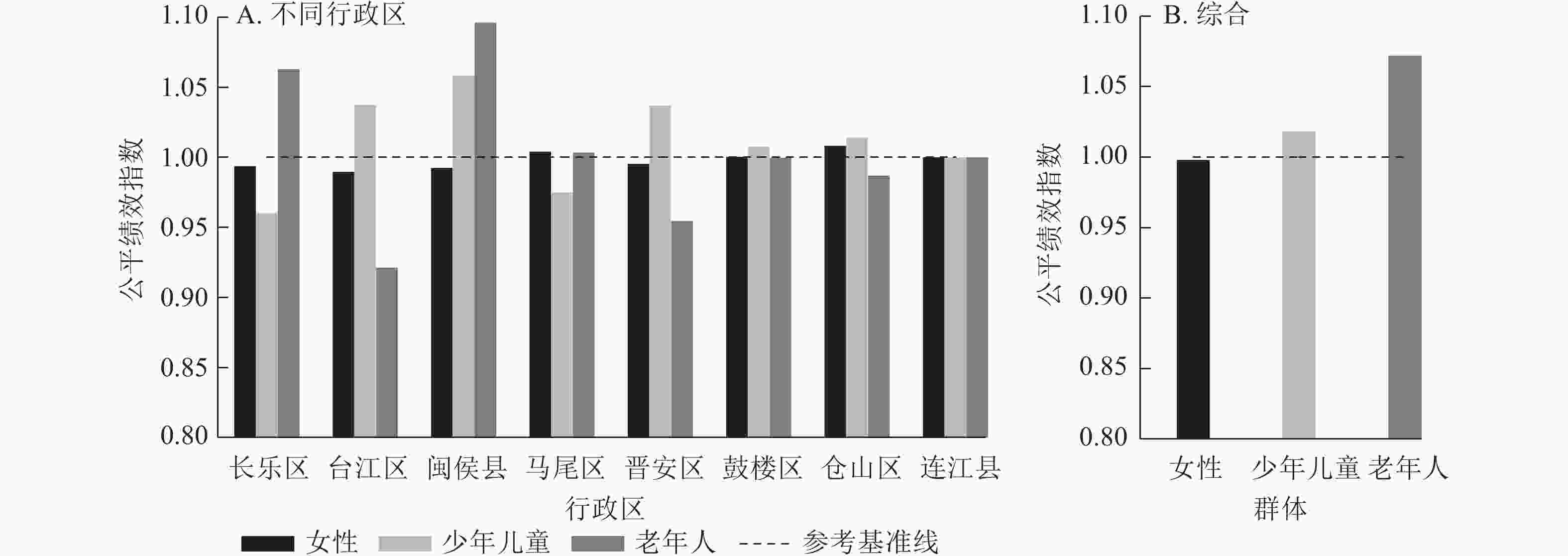 从不同群体公平绩效指数看,女性、儿童、老人对公园的使用更频繁,公园绿地设施需求更高。采用公平绩效指数来衡量公园绿地的可达性水平对3类重点人群的公平性。如图6A所示:女性公平绩效评价结果在不同行政区内较为稳定,均接近于1,其中在长乐区、台江区、闽侯县和晋安区中,女性群体享有公园绿地的可达性均低于平均水平。相较于女性群体,少年儿童的公平绩效指数略有参差,且仅长乐区与马尾区的公园绿地可达性低于平均水平。老年人的公平绩效指数在不同行政区差异最大,鼓楼区、台江区、晋安区和仓山区内,老年人群体享有公园绿地的可达性均未达到研究区平均水平,闽侯县的指数最高,表明老年人在闽侯县能更便捷到达公园绿地。