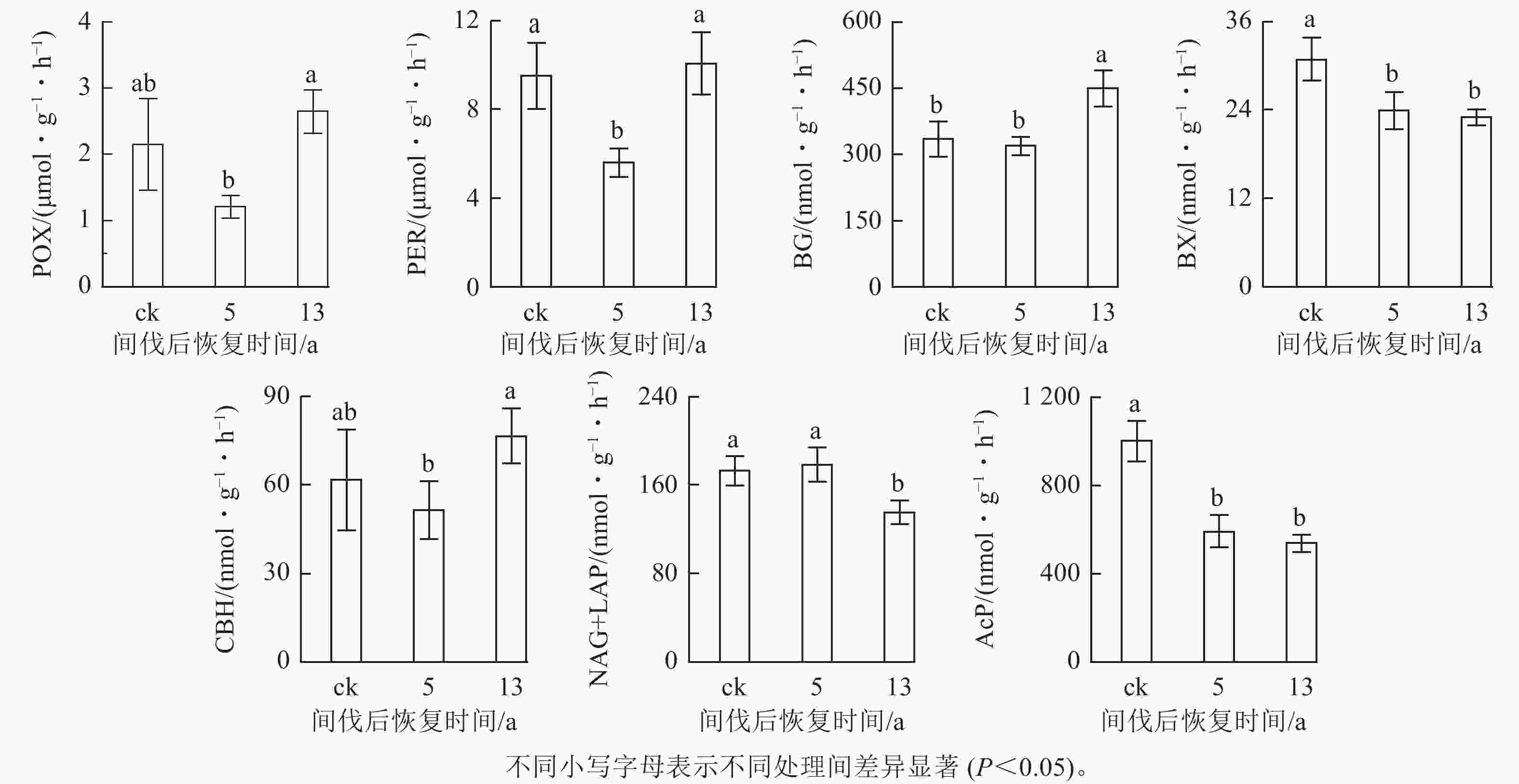 从图1可见:间伐恢复对不同土壤酶活性的影响并不一致。恢复13 a时土壤BX、AcP和NAG+LAP活性显著下降(P<0.05),较ck分别降低了25.39%、22.92%和46.25%,同时土壤BG活性还显著提高(P<0.05),是ck的1.34倍(P<0.05)。土壤氧化酶(POX、PER)和CBH活性变化趋势与前4种酶不同,在恢复5 a时活性最低,在恢复13 a时活性最高。