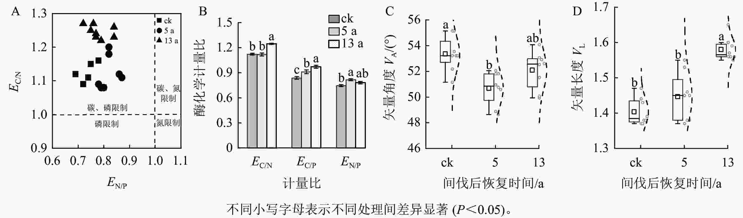 $$ {E}_\text{C/N}\text{}\text=\text{}\text{ln}{H}_{\mathrm{B}\mathrm{G}}\text{/ln}\text{(}{H}_{\text{NAG}}\text+{H}_{\text{LAP}}\text{)}\text{;}\text{}\text{}\text{} $$ (1) $$ {E}_\text{C/P}\text{}\text=\text{}\text{ln}{H}_{\text{BG}}\text{/ln}{H}_{{\mathrm{Ac}}\mathrm{P}};\text{}\text{}\text{}\text{}\text{}$$ (2) $$ {E}_\text{N/P}\text{= ln}\text{(}{H}_{\text{NAG}}\text+{H}_{\text{LAP}}\text{)}\text{/ln}{H}_{{\mathrm{Ac}}\mathrm{P}}; $$ (3) $$ {V}_{\text{L}}\text=\text{SQRT}\text{[}\text{(}{E}_\text{C/N}\text{)}^2\text+\text{(}{E}_\text{C/P}\text{)}^2\text{]}\text{;} $$ (4) $$ {V}_{\text{A}}\text=\text{Degrees}\text{[}\text{ATAN2}\text{(}{E}_\text{C/P}\text{,}\text{}{E}_\text{C/N}\text{)}\text{]}\text{。}$$ (5) 式(1)~(5)中:$ {E}_\text{C/N} $、$ {E}_\text{C/P} $、$ {E}_\text{N/P} $分别为土壤碳获取酶/氮获取酶比值、土壤碳获取酶/磷获取酶比值、土壤氮获取酶/磷获取酶比值;$ {H}_{\mathrm{B}\mathrm{G}}\mathrm{、}{H}_{\text{NAG}}\mathrm{、}{H}_{\text{LAP}}\mathrm{、}{H}_{{\mathrm{Ac}}\mathrm{P}} $分别为BG、NAG、LAP、AcP的酶活性;SQRT为平方根函数,Degrees为角度转换函数,ATAN2为反正切函数。VL越大,表明碳限制越严重。VA以45°为分界线,>45°为磷限制,<45°为氮限制。偏离程度越大,限制程度越强。