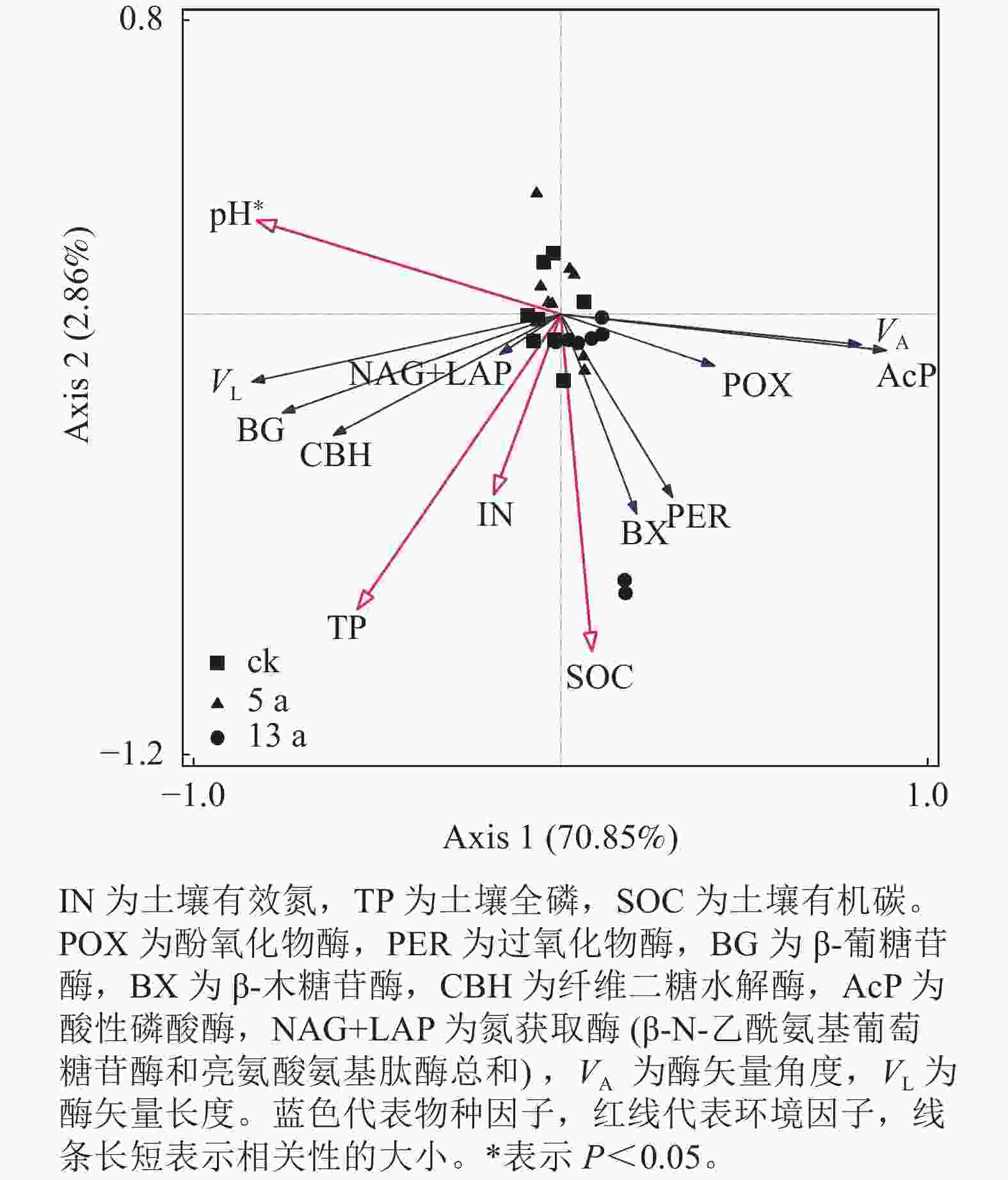 指标 pH IN TP SOC MBC MBC/MBN N/P POX −0.54 −0.29 −0.04 −0.07 0.26 0.30 −0.04 PER −0.65* 0.19 0.32 0.45* 0.22 0.52** 0.21 BG 0.28 0.35 0.73** 0.55** 0.63** 0.38 −0.25 BX −0.53 0.54** −0.01 0.27 0.10 0.45* 0.56 CBH −0.01 0.24 0.46* 0.43* 0.53** 0.65** 0.17 AcP −0.72* 0.57** −0.38 0.06 −0.13 0.22 0.85** NAG+LAP 0.17 0.66** −0.08 0.14 −0.01 0.00 0.60 VA −0.95** 0.01 −0.30 −0.06 −0.04 0.35 0.43 VL 0.45 −0.28 0.70** 0.31 0.48* 0.15 −0.63* 说明:IN为土壤有效氮,TP为土壤全磷,SOC为土壤有机碳,MBC为微生物量碳,MBN为微生物量氮,N/P为氮磷比。POX为酚氧化物酶,PER为过氧化物酶,BG为β-葡糖苷酶,BX为β-木糖苷酶,CBH为纤维二糖水解酶,AcP为酸性磷酸酶,NAG+LAP为氮获取酶(β-N-乙酰氨基葡萄糖苷酶和亮氨酸氨基肽酶总和),VA为酶矢量角度,VL为酶矢量长度。*表示显著相关(P<0.05),**表示极显著相关(P<0.01)。 -