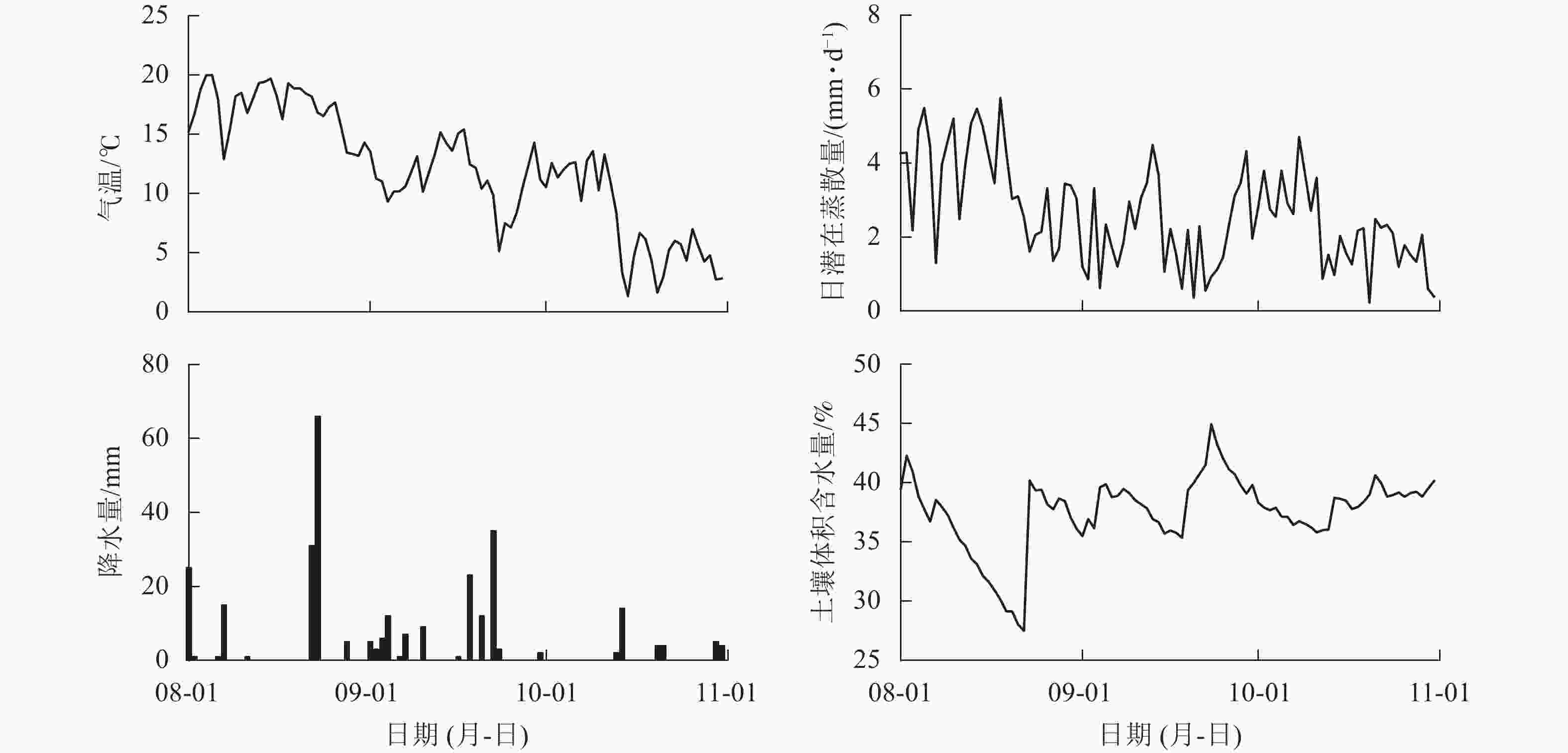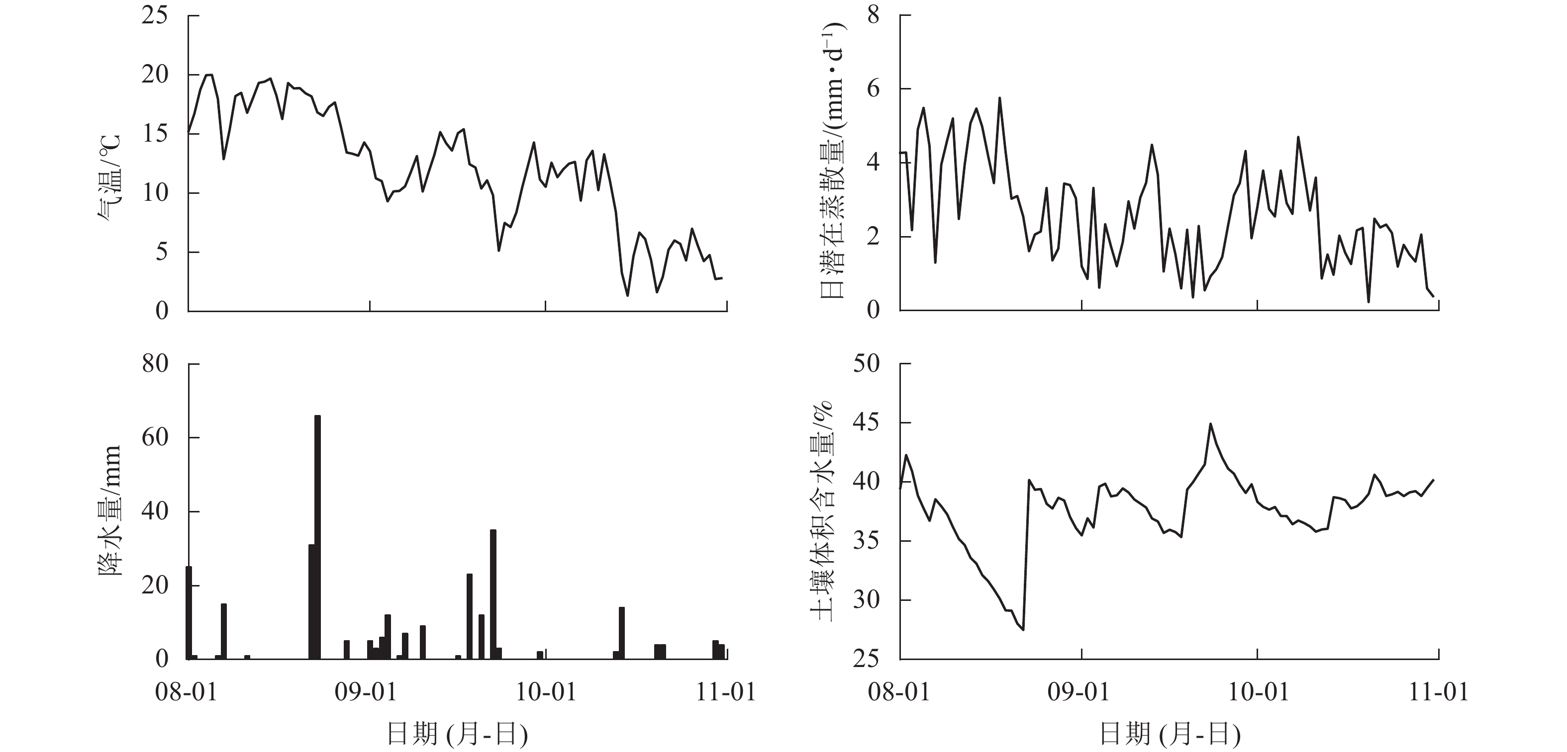 研究期间日均气温和日潜在蒸散量总体呈逐渐降低的波浪状变化(图1),其均值分别为12.02 ℃和2.61 mm·d−1,极差分别为18.69 ℃和5.53 mm·d−1,变异系数分别为41.43%和51.86%;降水量总和为297.0 mm,其中,8和9月分别为145.0、119.0 mm,占比分别为48.82%和40.07%;林地土壤体积含水量呈波浪状变化,平均为37.57%,在8、9、10月分别为35.69%、38.93%、38.13%。