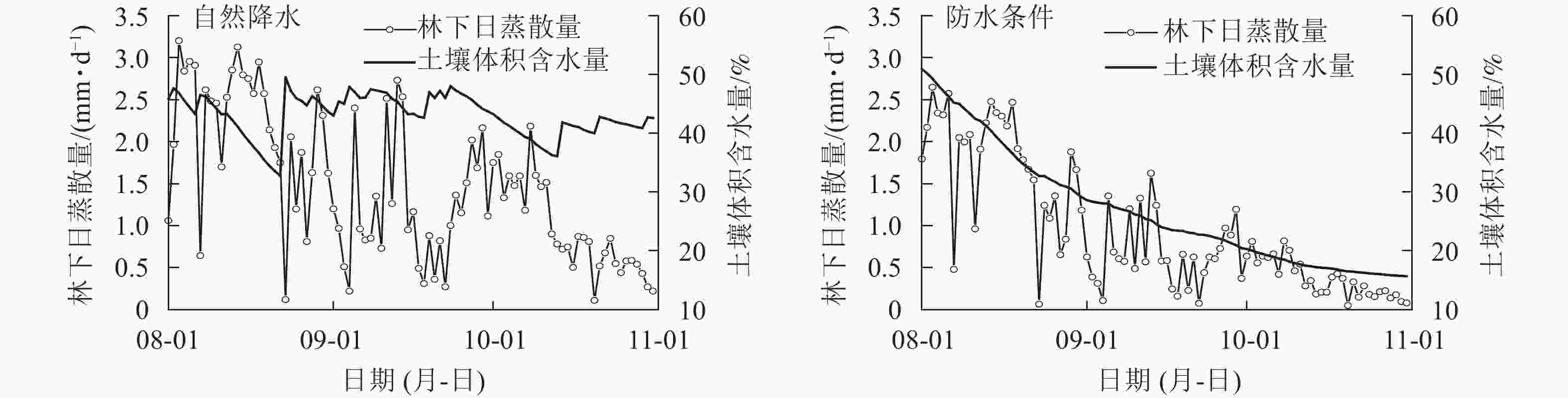 本研究表明:虽然林下蒸散同时受降水、气温、太阳辐射等气象条件的综合影响,但在8—10月的研究期间,林下日蒸散量整体呈逐渐减小趋势。这主要是因为研究期间与林下蒸散呈正效应的气象因子(太阳辐射、气温、风速、饱和水汽压差等)均呈逐渐降低趋势,气温和土温降低、太阳辐射减弱、饱和水汽压差和潜在蒸散减小等均会导致林下蒸散量减小,而相对湿度与林下蒸散存在负效应。以往研究得出相似结论,如有分析表明:潜在蒸散与气温、风速、日照时数呈正相关,与相对湿度呈负相关[21],蒸散的减小与太阳辐射减弱有关[22],潜在蒸散量主要受风速和温度的影响[23]。本研究中,林下日蒸散量波动幅度较大,这与波浪状的日潜在蒸散和脉冲式降水条件密切相关。自然条件时的林下日蒸散量数值及波动范围均大于防水处理,原因是防水处理遮断了降水输入,造成土壤含水量低于自然条件,从而限制了林下蒸散。自然条件的林下日蒸散量与土壤体积含水量相关性不显著,主要是因为受脉冲式降水输入的不断干扰,土壤湿度对林下蒸散的影响较小;防水条件的林下日蒸散量与土壤体积含水量显著正相关,表明林下蒸散受土壤湿度的影响较大。