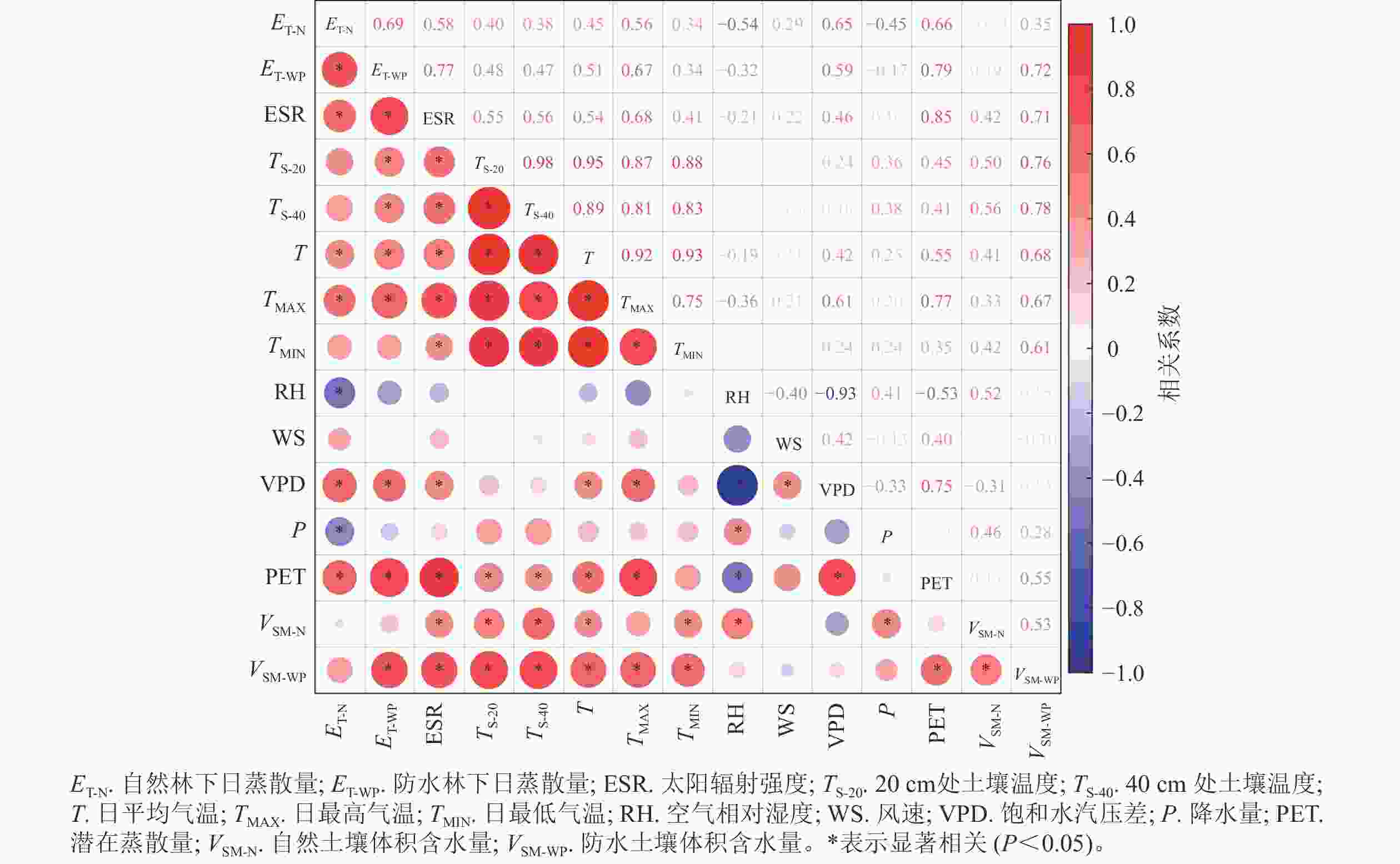 相关分析(图3)显示:2种水分条件的林下日蒸散量与多个环境因子的相关性呈相似的变化特征。林下日蒸散量与空气相对湿度、降水量、自然条件的土壤湿度呈显著负相关(P<0.05),与其他环境因子均呈正相关。自然条件的林下日蒸散量与降水量显著负相关(P<0.05),与空气相对湿度、风速、饱和水汽压、降水量的相关性强于防水条件的林下日蒸散量,与太阳辐射、土壤温度、气温、潜在蒸散的相关性弱于防水条件的林下日蒸散;防水条件的林下日蒸散量与土壤体积含水量显著正相关(P<0.05)。