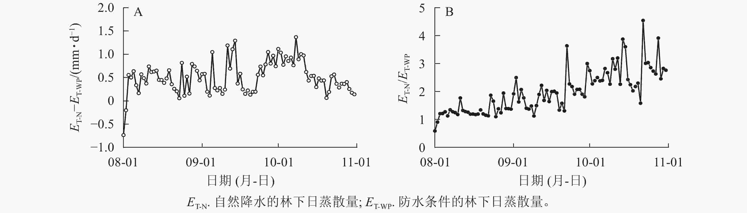 从8月1日至10月31日,有无雨水输入造成的不同土壤水分条件下的林下日蒸散量差值的变化见图4A。在8月,除了前2 d内因人为浇水导致自然降水的日蒸散量低于防水条件从而使两者差值为负值外,之后的两者差值均为正值。2种土壤水分条件的林下日蒸散量差值总体在中期较大,前期、后期相对较小,主要是因前期两者的土壤湿度差异较小,后期的潜在蒸散能力减弱。在8、9、10月,自然降水与防水条件下日蒸散量之差的均值依次为0.41、0.54、0.59 mm·d−1。在9、10月,两者的差值较大,甚至高于防水条件日蒸散量,说明8—10月随着土壤水分差异的增大(8、9、10月两者的土壤体积含水量差值依次为3.92%、21.06%、23.31%)对林下日蒸散量的影响也在逐渐增加。