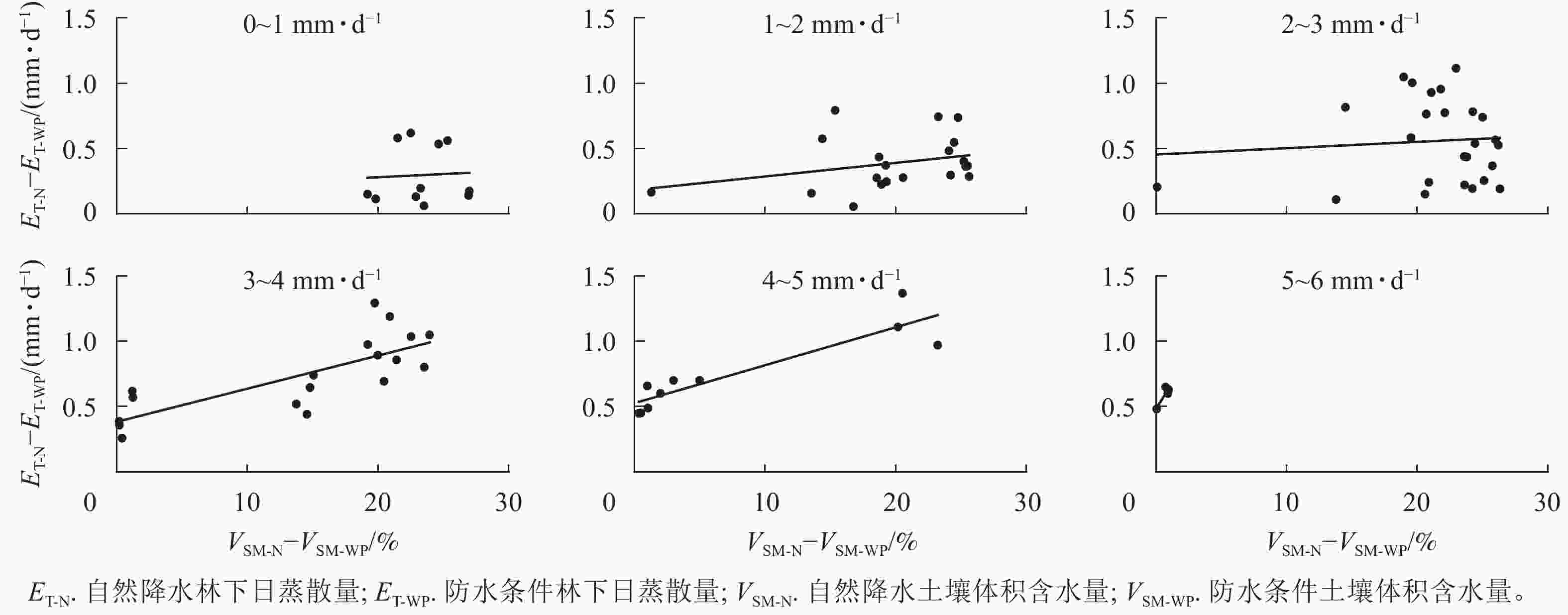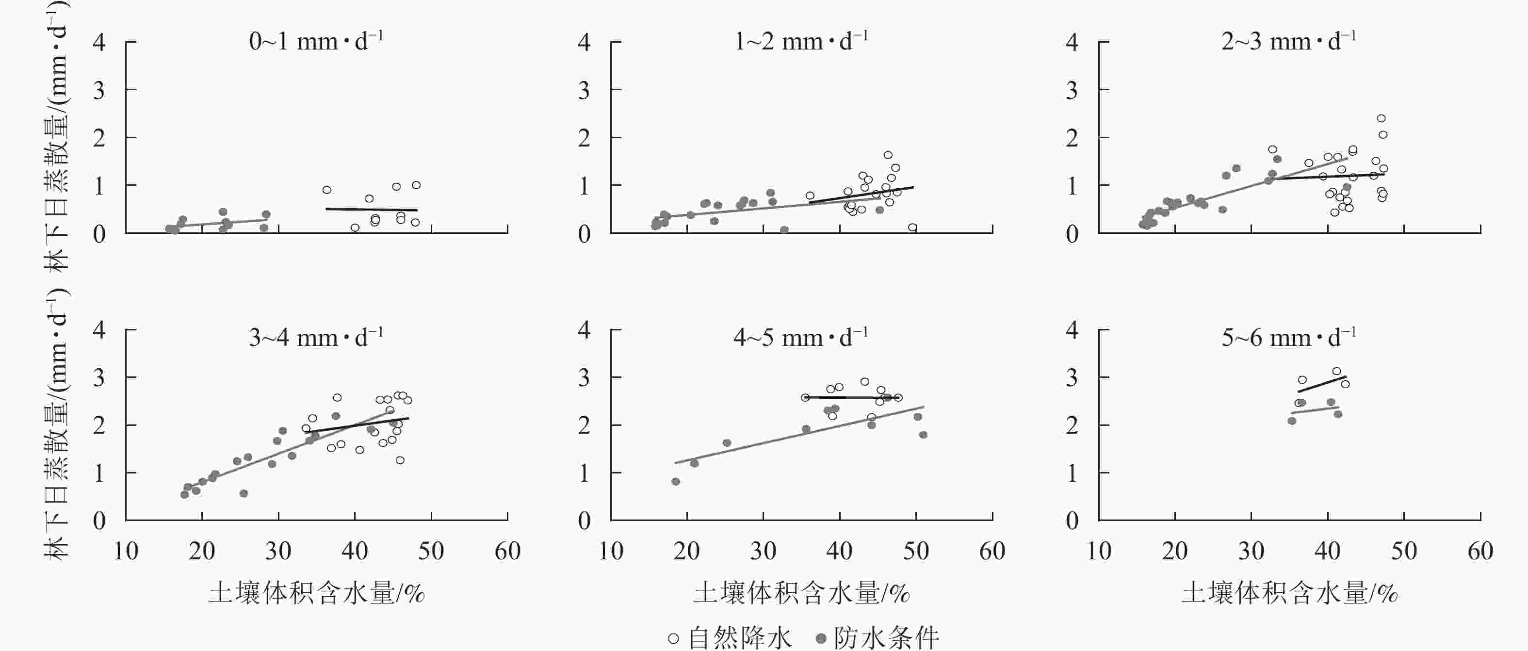 相关分析(图3)表明:2种水分条件的林下日蒸散量与潜在蒸散均呈显著正相关(P<0.05)。为在排除潜在蒸散影响后评价土壤水分条件对林下日蒸散量的影响,将潜在蒸散分为6组(0~1、1~2、2~3、3~4、4~5、5~6 mm·d−1)作图分析(图5),可知在各级潜在蒸散时2种水分条件的林下日蒸散量均随土壤体积含水量增加而增加。总体来看,自然降水的林下日蒸散量均高于防水条件的林下日蒸散量。这主要是因为前者土壤湿度一般都高于后者,但在两者土壤湿度相近时(图5中潜在蒸散大于3 mm·d−1的个别数据),其林下日蒸散量数值也相近,说明两者遵循相同的林下蒸散变化规律。