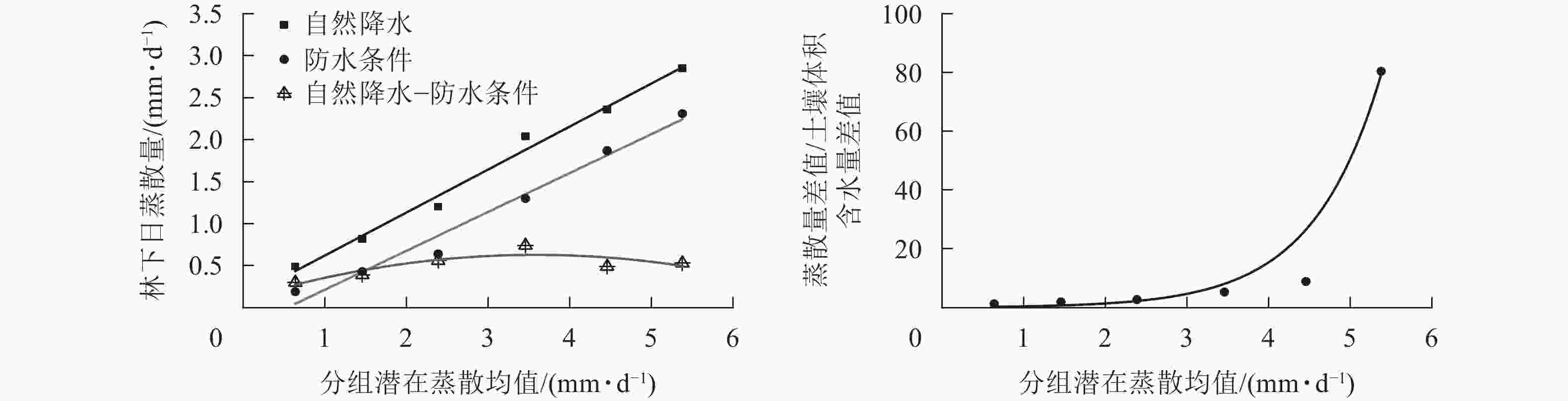 本研究区降水主要集中于7—9月。有学者在相同区域发现:林下蒸散主要集中在6—9月,其中8月林下蒸散量最大[18]。以往研究主要集中于环境因子对林下蒸散(林地蒸散、土壤蒸发)的作用,如刘栋等[27]认为:影响油茶Camellia oleifera林地土壤蒸发的因子存在阶段性差异,前期主要为气温、地温等,中期为气温、空气相对湿度等,后期为地温、太阳辐射等。吴友杰等[28]认为:影响土壤蒸发的主要因素为土壤含水量和太阳辐射。本研究主要对遮断降水输入和自然降水输入2种条件的林下蒸散进行分析,采用不同蒸散潜力时2种水分条件的林下日蒸散量差与土壤体积含水量差的比值表示土壤湿度对林下蒸散的影响大小,表明当潜在蒸散小于3 mm·d−1时,土壤湿度对林下蒸散影响较小;当潜在蒸散大于3 mm·d−1时土壤湿度的影响增大;当潜在蒸散大于5 mm·d−1时,土壤湿度的影响极明显。随着潜在蒸散增加,2种水分条件的林下日蒸散量差与土壤体积含水量差的比值成指数倍地增加,土壤湿度对林下蒸散的影响增强。本研究从8月初开始,在11月初结束,潜在蒸散基本呈现逐渐减小趋势。若实验是从5月初开始,不同蒸散潜力时的林下日蒸散量与土壤体积含水量、2种水分条件的林下日蒸散量差值与土壤体积含水量差值的关系可能会与现有研究结果有所不同,所以未来应该继续加强研究。