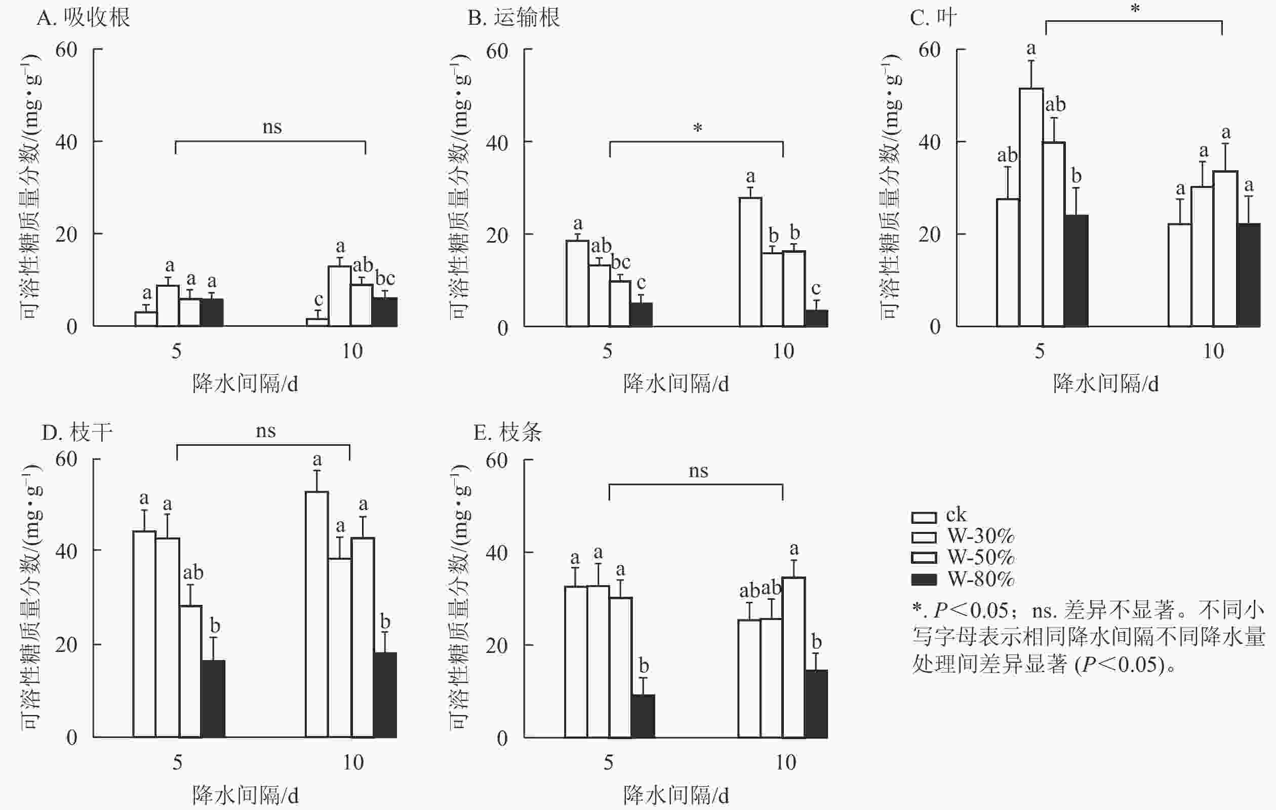 降水量对杉木幼苗不同器官可溶性糖质量分数具有极显著影响(P<0.01),降水间隔则整体无显著影响(表1)。由图1可知:降水间隔对运输根和叶的可溶性糖质量分数有显著影响(P<0.05),对吸收根、枝干和枝条无显著影响。T5处理下,随着降水量的减少,可溶性糖质量分数在吸收根、叶和枝条中呈先增加后减少的趋势,其中,枝条可溶性糖质量分数在W-80%处理下最小,显著低于ck (P<0.05),比ck降低了71.9%;可溶性糖质量分数在运输根和枝干中表现为持续减少,均在W-80%处理下最小,显著低于ck (P<0.05),分别降低了72.8%和63.1%。T10处理下,随着降水量减少,可溶性糖质量分数在吸收根、叶和枝条中呈先增加后减少的趋势,其中,吸收根的可溶性糖质量分数在W-30%处理下最大,显著高于ck (P<0.05),为ck的9.6倍;在运输根和枝干中可溶性糖质量分数表现为先减少后增加再减少,均在W-80%处理下最小,显著低于ck (P<0.05),分别降低了87.9%和65.8%。