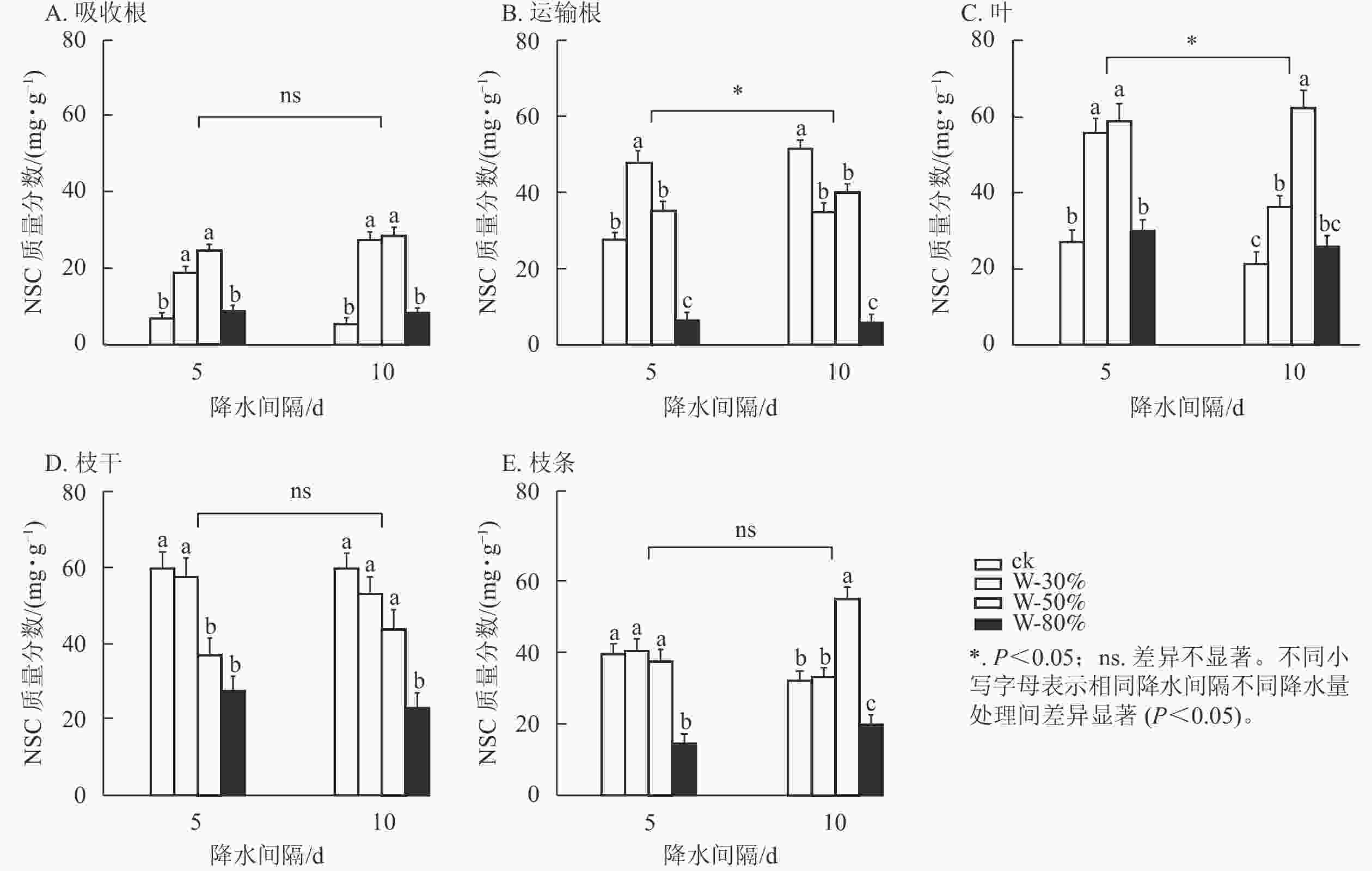 降水量对杉木幼苗不同器官NSC质量分数具有极显著影响(P<0.01),降水量和降水间隔的共同作用对NSC质量分数整体有极显著影响(P<0.01),降水间隔则整体无显著影响(表1)。T5处理下,随着降水量的减少,NSC质量分数在吸收根、运输根、叶和枝条中呈先增加后减少的趋势(图3),其中,吸收根和叶的NSC质量分数在W-50%处理下最大,均显著高于ck (P<0.05),分别为ck的3.6和2.2倍;运输根和枝条的NSC质量分数在W-80%处理下最小,均显著低于ck (P<0.05),分别降低了79.5%和63.3%;NSC质量分数在枝干中表现为持续减少,在W-80%处理下最小,显著低于ck (P<0.05),比ck降低了53.9%。T10处理下,随着降水量的减少,NSC质量分数在吸收根、叶和枝条中呈先增加后减少的趋势,且吸收根、叶和枝条的NSC质量分数均在W-50%处理下最大,显著高于ck (P<0.05),分别为ck的5.3、3.0和1.7倍;NSC质量分数在运输根中表现为先减少后增加再减少,在枝干中表现为持续减少,均在W-80%处理下最小,显著低于ck (P<0.05),分别降低了88.7%和61.5%。