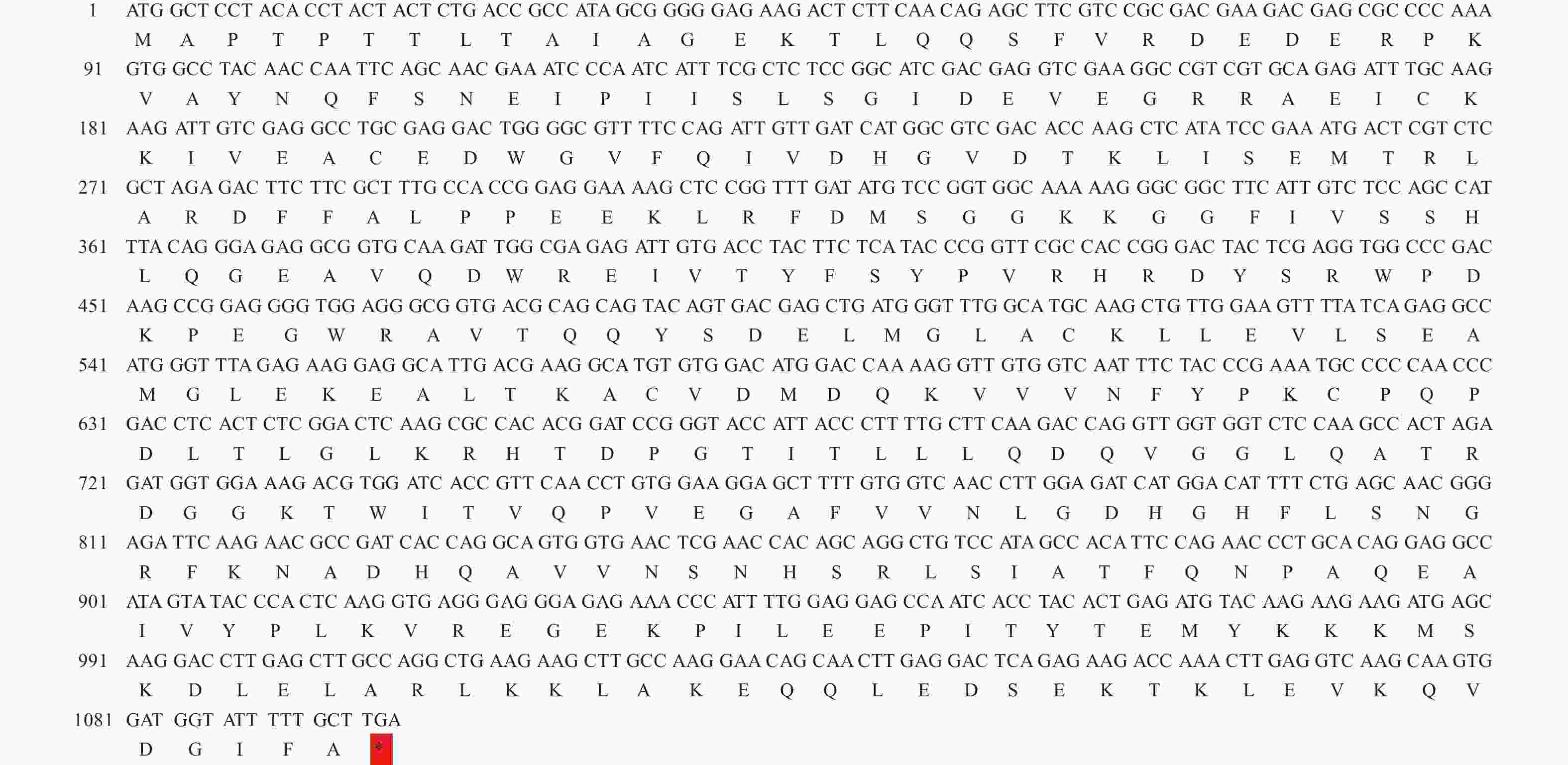 以反转录合成的掌叶覆盆子cDNA为模板,成功扩增得到目的基因片段(图1A)。对基因片段进行切胶回收,连接转化至DH5α感受态,12 h后对阳性单克隆菌液进行PCR验证并测序分析。结果显示:目的片段长度为1 098 bp,将其命名为RcF3H。RcF3H基因定位于第1条染色体内,由1个外显子构成,共编码了365个氨基酸(图2)。