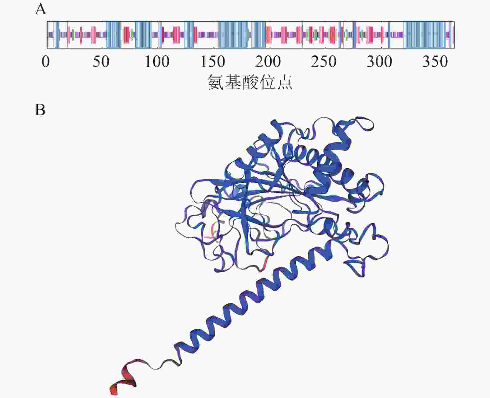 RcF3H蛋白的二级结构预测发现:该蛋白存在α-螺旋、β-折叠、直链延伸和无规则卷曲4种结构,其中以α-螺旋和无规则卷曲占比最大,分别占37.53%和38.63%,而直链延伸和β-折叠分别占18.36%和5.48% (图5)。此外,以石榴Punica granatum蛋白(编号:A0A218XVH5.1)为模板,对RcF3H蛋白的三级结构进行建模。建模的三级结构覆盖率为92.31%,序列一致性为85.75%。该结果与二级结构预测结果一致。