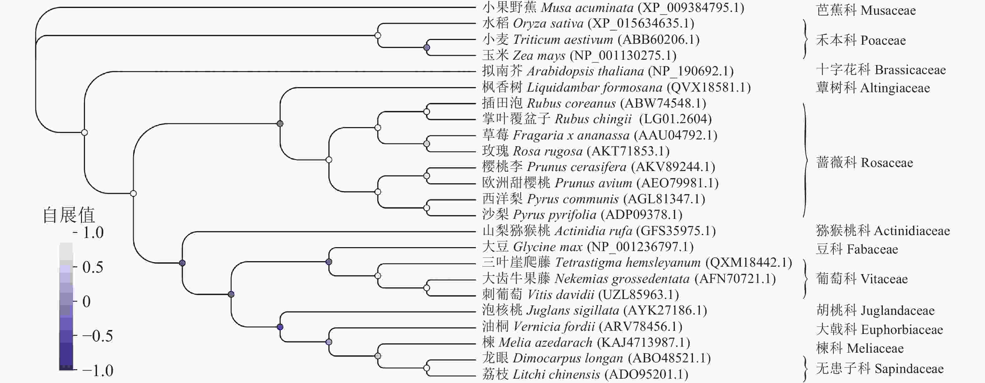 多序列比对分析发现:蔷薇科F3H蛋白序列具有很高的相似度,其中RcF3H与插田泡Rubus coreanus、草莓和玫瑰Rosa rugosa的相似性超过95%,与樱桃李Prunus cerasifera、欧洲甜樱桃Prunus avium和西洋梨Pyrus communis相似性接近90% (图6)。系统进化树分析发现:RcF3H与蔷薇科插田泡蛋白(编号:ABW74548.1)的亲缘关系最密切。同科属的F3H蛋白在系统进化上处于同一分支。与单子叶植物相比,掌叶覆盆子RcF3H与双子叶植物关系更密切,属于同一亚组(图7)。以上结果说明掌叶覆盆子RcF3H蛋白在生物进化过程中较为保守。