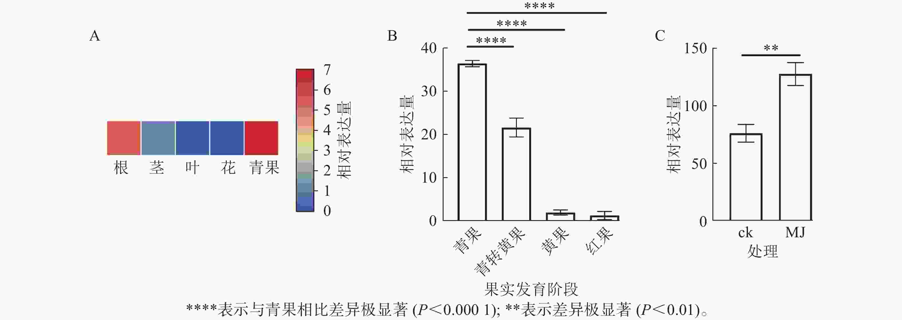 由图8A可知:RcF3H基因在掌叶覆盆子的根、茎、叶和果实中表达;其中青果中的相对表达量最高,分别是根的1.18倍,茎的5.05倍,叶片的46.00倍。表明RcF3H可能与掌叶覆盆子果实的生长发育有关。进一步分析在果实发育成熟过程中RcF3H基因的相对表达量。由图8B可知:RcF3H基因表达在青果期表达量最高,并在发育成熟过程表达量逐渐下降,该趋势与类黄酮质量分数变化一致[23]。启动子顺式作用元件分析发现:掌叶覆盆子RcF3H基因前2 000 bp启动子上存在响应MeJA的顺式作用元件(表2)。结合RT-qPCR技术发现:掌叶覆盆子RcF3H基因经过MeJA诱导处理后基因表达明显上升(图8C)。