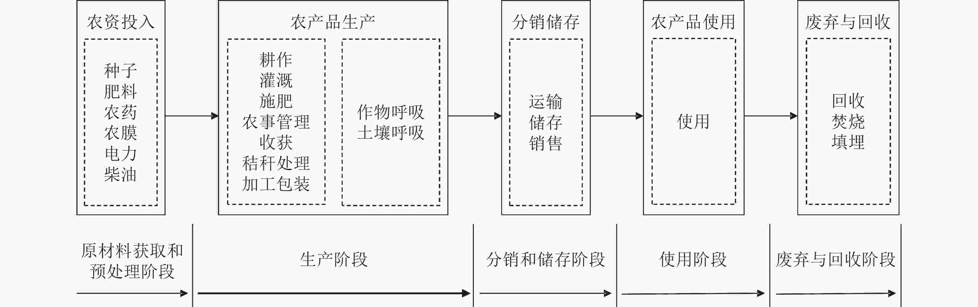 按照生命周期评估方法,农产品碳足迹包括农资等投入品的生产、运输,农产品生产、加工,农产品分销存储运输,农产品使用和废弃等全生命周期排放的温室气体(图1)[4,19]。
