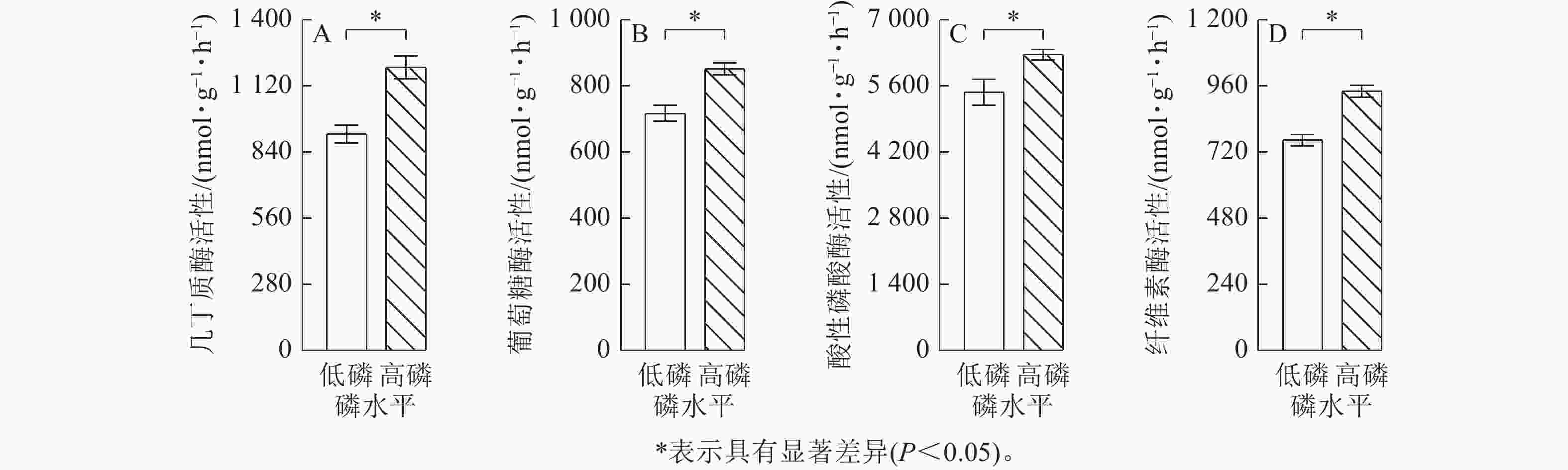 • 图2可见:低磷条件下的玉米菌根侵染率比高磷条件下显著增加了2.0倍(P<0.05),易提取态球囊霉素蛋白质量分数比高磷条件下显著增加了16% (P<0.05)。总球囊霉素蛋白质量分数在低磷、高磷条件下没有显著差异。玉米在高磷条件下的几丁质酶活性、葡萄糖酶活性、酸性磷酸酶活性、纤维素酶活性比低磷条件下显著增加了10%~30% (P<0.05)(图3)。