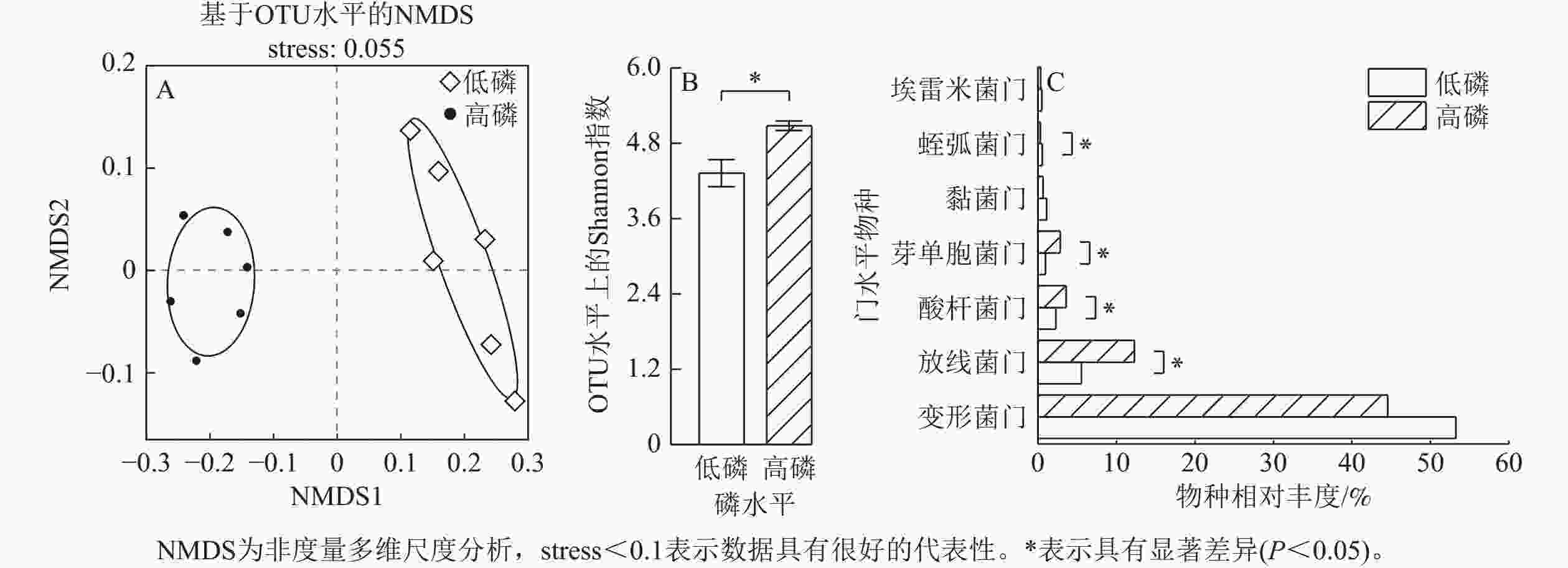 • 采用Excel 2019和SPSS 22.0进行数据分析。采用独立样本T检验进行方差分析,对不同磷质量分数处理下的结果进行Duncan’s法差异显著性检验,显著性水平为0.05。对得到的所有OTU进行α多样性分析、β多样性分析(非度量多维尺度分析)和相对丰度组间差异显著性检验。采用线性回归法分析酶活性与根际微生物物种相对丰度的相关关系。采用Origin 2022绘图。数据结果以平均值±标准差表示。