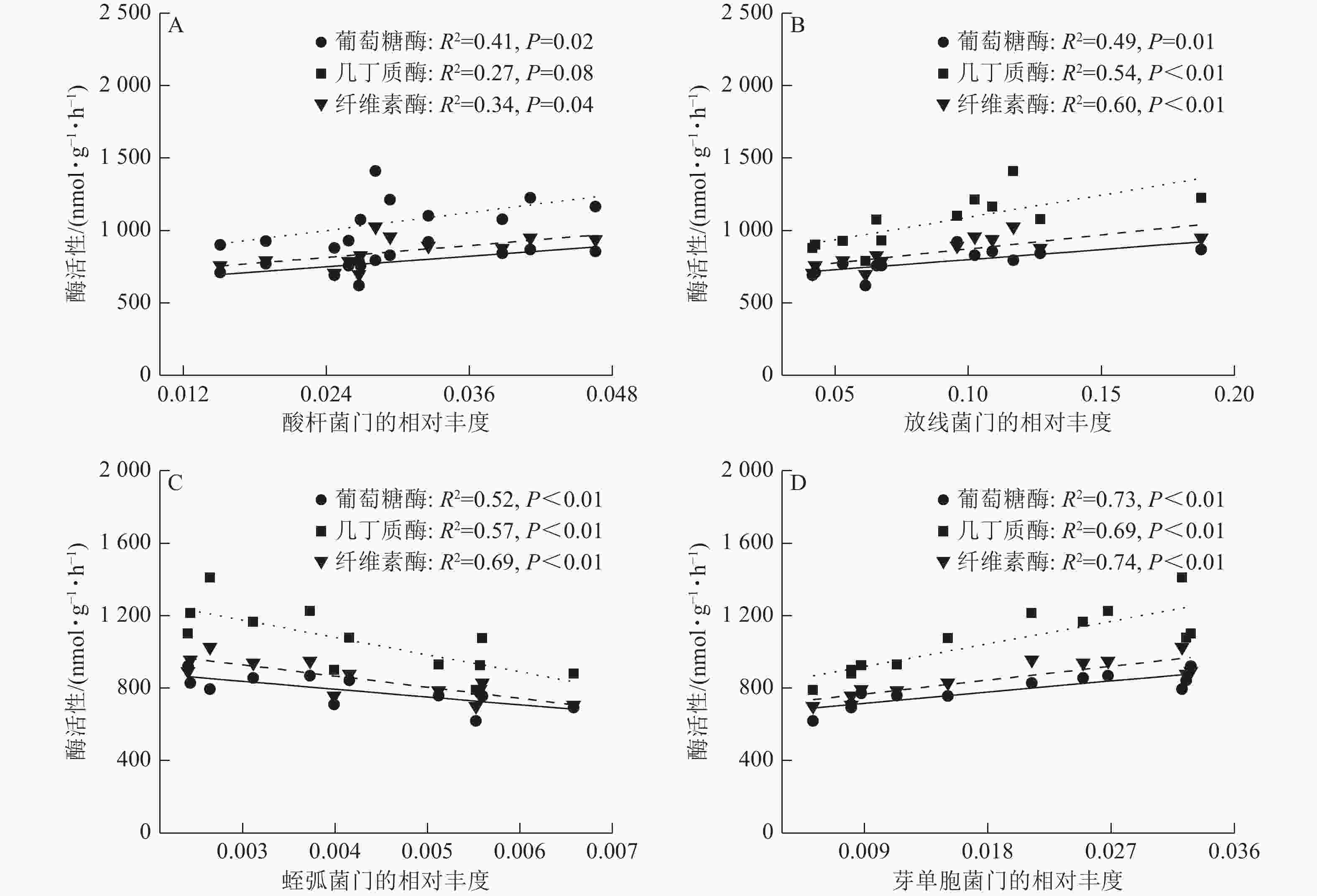 • 图5可见:酸杆菌门的相对丰度与葡萄糖酶活性、纤维素酶活性具有较强的正相关线性关系。酸杆菌门、芽单胞菌门的相对丰度与葡萄糖酶活性、几丁质酶活性和纤维素酶活性具有较强的正相关线性关系。蛭弧菌门的相对丰度与葡萄糖酶活性、几丁质酶活性和纤维素酶活性具有较强的负相关线性关系。