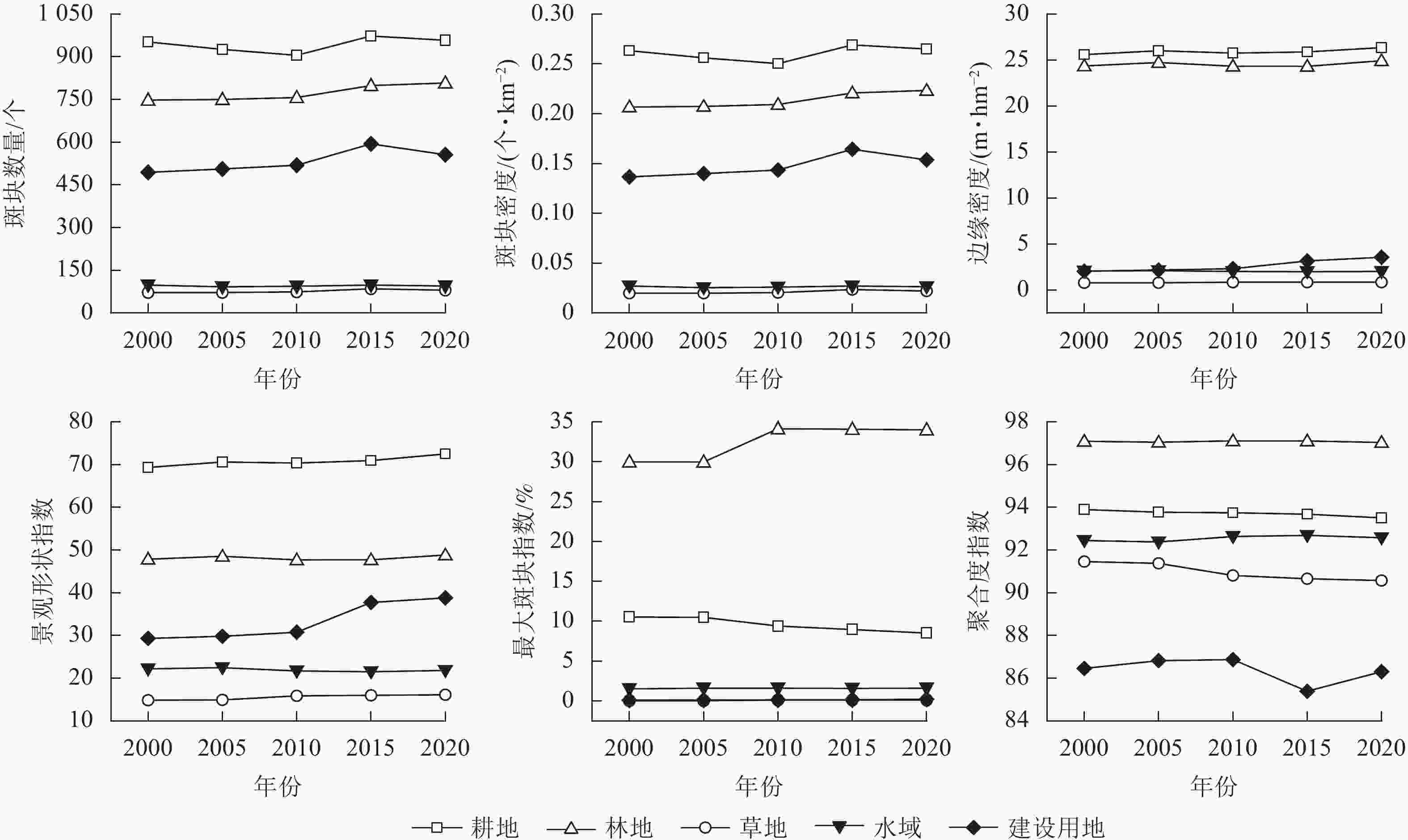 • 图3可知:研究期间耕地的斑块数量和斑块密度先减后增,表明近年来耕地破碎化加剧。林地的斑块数量和斑块密度增加,说明其异质性和破碎化增强;耕地最大斑块指数减少、林地的增加,表明林地优势度上升。耕地和林地的边缘密度和形状指数整体上升,聚合度下降。建设用地的斑块数量和斑块密度整体先增后减,边缘密度、形状指数和最大斑块指数持续增加,聚合度呈先增后减趋势。草地和水域各景观指数变化不明显。