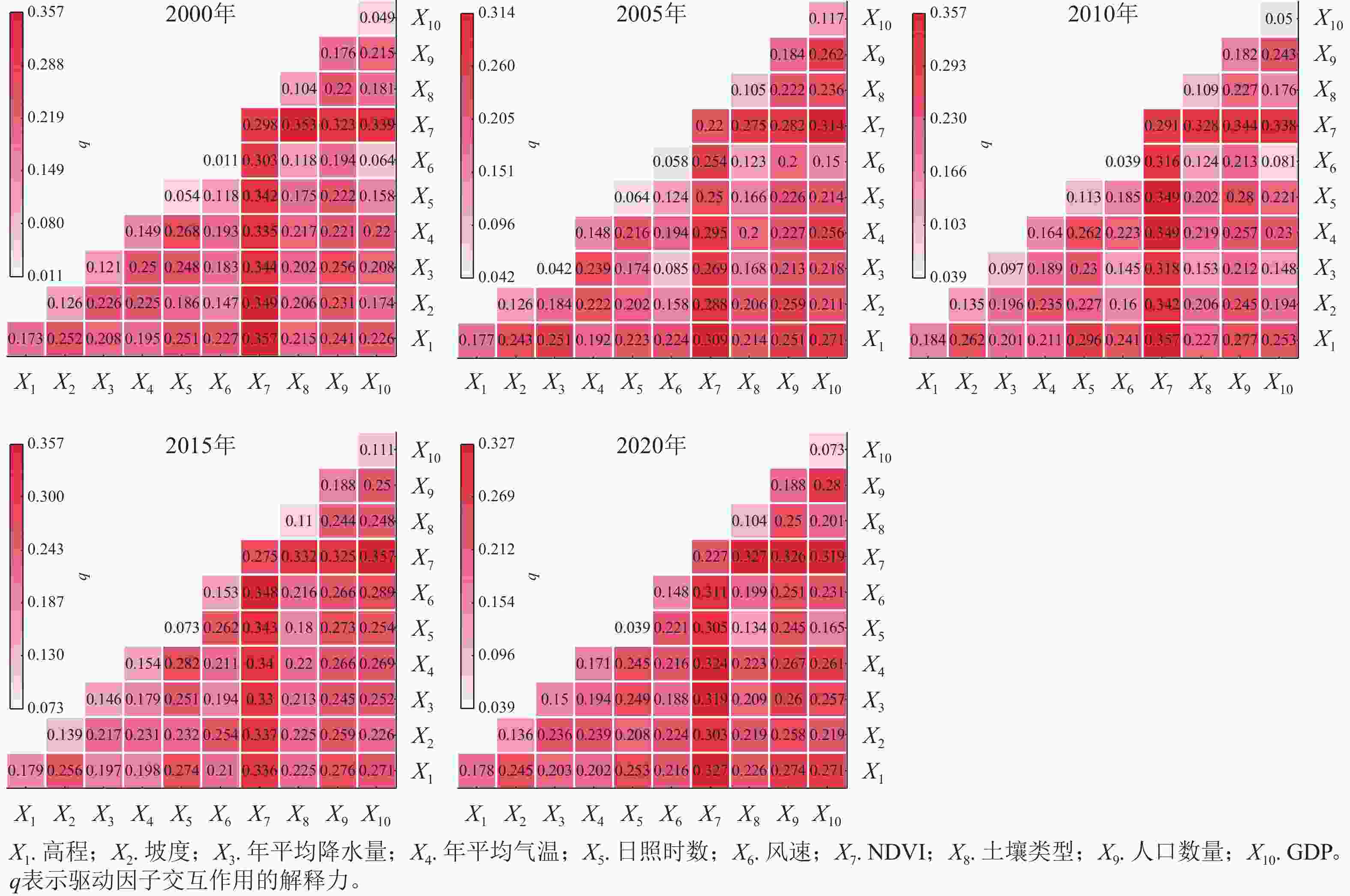 • 图6可知:2000、2010和2020年,NDVI与高程的交互作用对景观格局变化影响最强,q分别为0.357、0.357和0.327;而在2005和2015年,NDVI与GDP的交互作用最强,q分别为0.314和0.357。NDVI在所有年份的交互探测中均为强影响因子。不同年份中,各驱动因子对景观格局变化表现出协同增强特征,即任意2个因子的交互作用均强于单一因子的影响,主要为双因子增强和非线性增强。其中,日照时数和GDP单独作用影响较小,但与其他因子交互后,多表现为非线性增强,明显提升了解释力度,说明研究格局变化受多因子共同驱动。