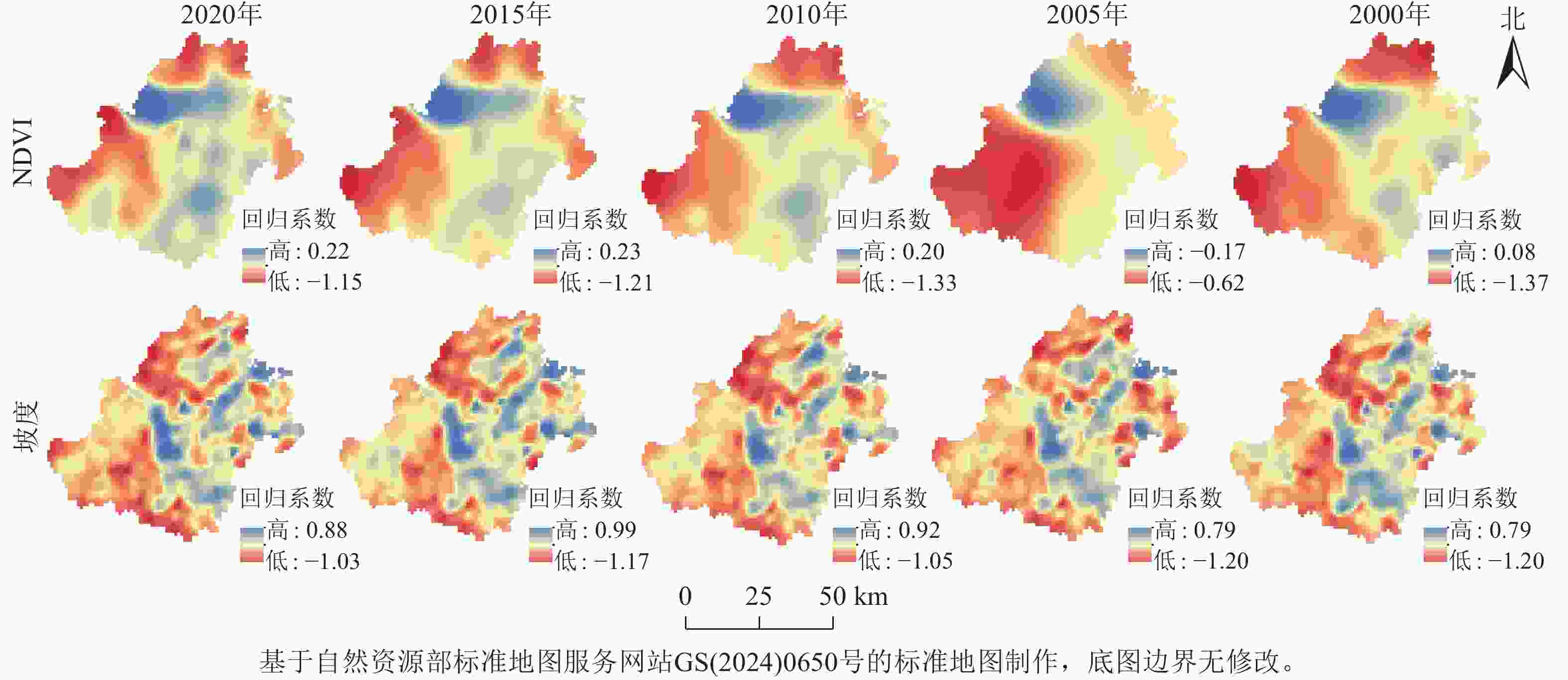 • 根据地理探测器结果对10个驱动因子进行共线性检验,即方差膨胀因子(VIF)<7.5,剔除高程和年平均气温等VIF>7.5的变量,并通过普通线性回归(OLS)最终筛选出NDVI和坡度2个驱动因子作为解释变量。通过赤池信息准则(AICc)、决定系数(R2)和调整后R2对OLS、地理加权回归(GWR)和多尺度地理加权回归(MGWR)模型进行对比(表5)显示:MGWR模型的AICc最低,R2和调整后R2相对高,模型性能优于其他2种方法。