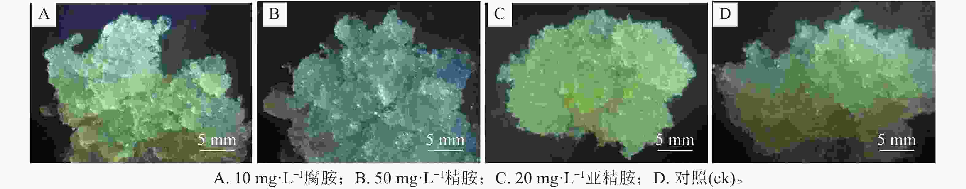 多胺(PAs)中的腐胺(Put)、精胺(Spm)、亚精胺(Spd)和热精胺(Tspm)等是一类脂肪族小分子,在植物中含量丰富,并且可以与核酸、酶、蛋白质和带负电荷的细胞功能基团结合,参与DNA、RNA和蛋白质代谢的调控[10]。多胺不仅在体细胞胚胎发育中发挥着重要作用,还参与植物衰老、芽分化以及生物和非生物胁迫反应的调控[11]。在植物体细胞胚胎发生过程中,内源多胺的含量会发生不同程度的变化[12]。SATHISH等[13]研究发现:外源多胺可使甘蔗Saccharumspp.的体细胞胚胎发生率提高2倍以上。邢更妹等[14]研究表明:维持一定水平的多胺对枸杞Lycium barbarum的体细胞胚发生至关重要。在对棉花Gossypium hirsutum体细胞胚胎发生时期的培养物进行多胺测定时发现:胚性愈伤组织形成后多胺含量显著上升[15]。尽管已有研究在棉花等植物中揭示了多胺对体细胞胚胎发生的调控作用,但多胺在红松体细胞胚胎发生过程中的功能仍不明确。目前,关于外源多胺对红松胚性愈伤组织增殖效应及其生理机制尚缺乏研究。鉴于此,本研究以红松胚性愈伤组织为材料,通过在增殖培养基中添加不同质量浓度的多胺,探究外源多胺对红松胚性愈伤组织增殖的影响,旨在为优化红松体细胞胚胎发生体系提供科学依据。
