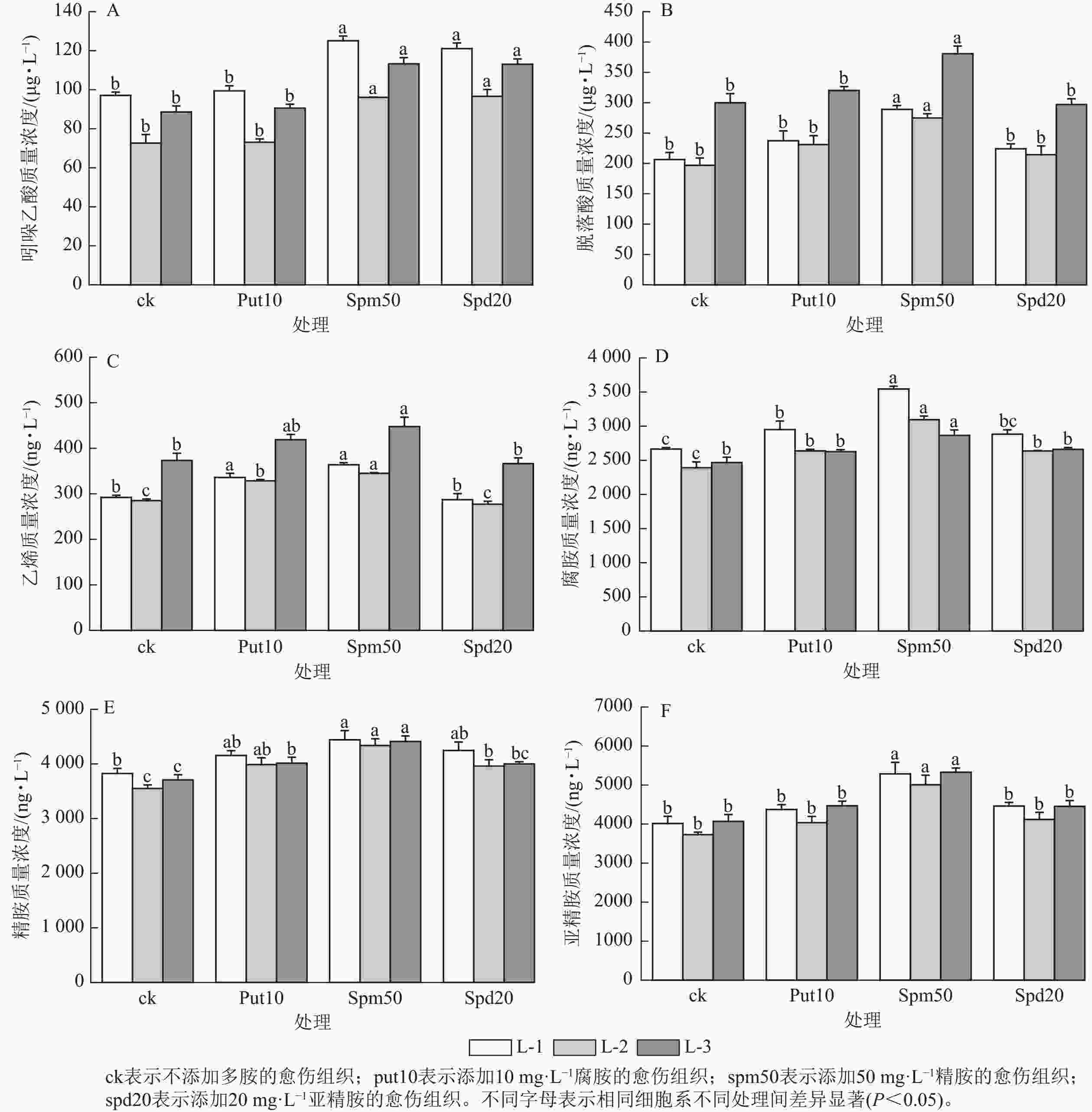 外源添加10 mg·L−1腐胺和50 mg·L−1精胺显著提高了L-1、L-2和L-3细胞系的乙烯质量浓度(P<0.05)(图4C)。而添加20 mg·L−1亚精胺对3个细胞系的乙烯质量浓度无显著影响。