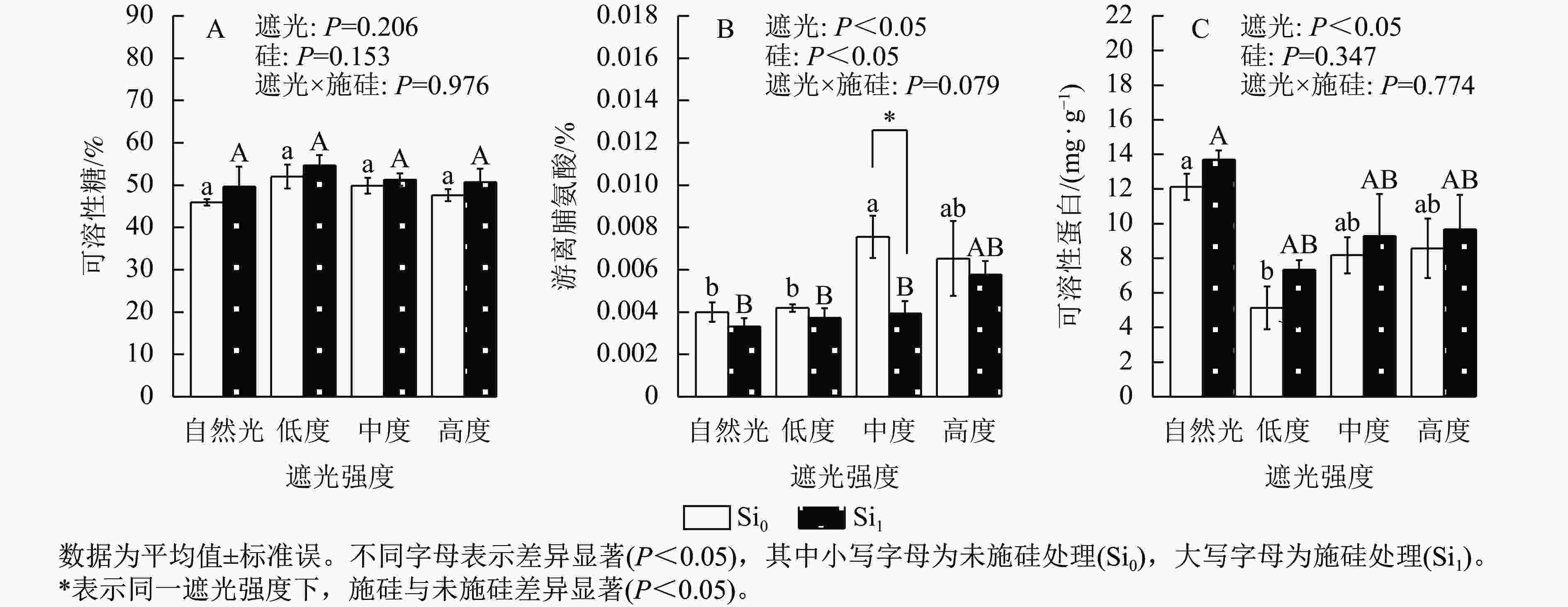 通过 Excel 2022 对数据进行计算和整理,使用DPS软件进行双因素方差分析,采用Duncan法进行多重比较检验不同处理间的差异显著性,显著水平为0.05。使用 SPSS 26.0 进行指标间相关性分析,采用Pearson相关分析法检验指标在不同遮光与施硅处理间的相关性,显著水平为0.05。使用Origin 2018 作图。