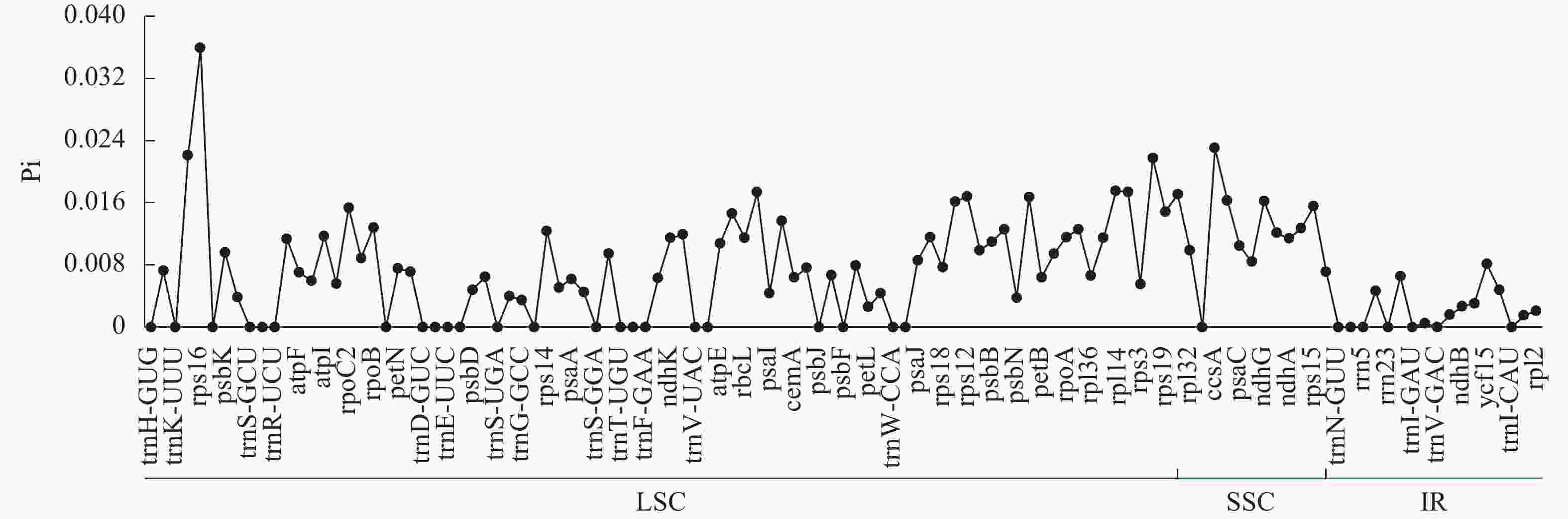 • 菜心、拟南芥、芥菜等8种十字花科植物的叶绿体基因组平均核苷酸多样性为0.007 2 (图3)。SSC区域的平均核苷酸多样性最高(0.012 3),LSC次之(0.007 4),IR区域的核苷酸多样性最低(0.002 1)。利用核苷酸多样性筛选出4个高变异区域(Pi≥0.02),发现LSC区域含有3个位点,分别为rps16、matKrpl22,SSC区域含有1个位点,为ccsA,其中变异度最高的位点为rps16。