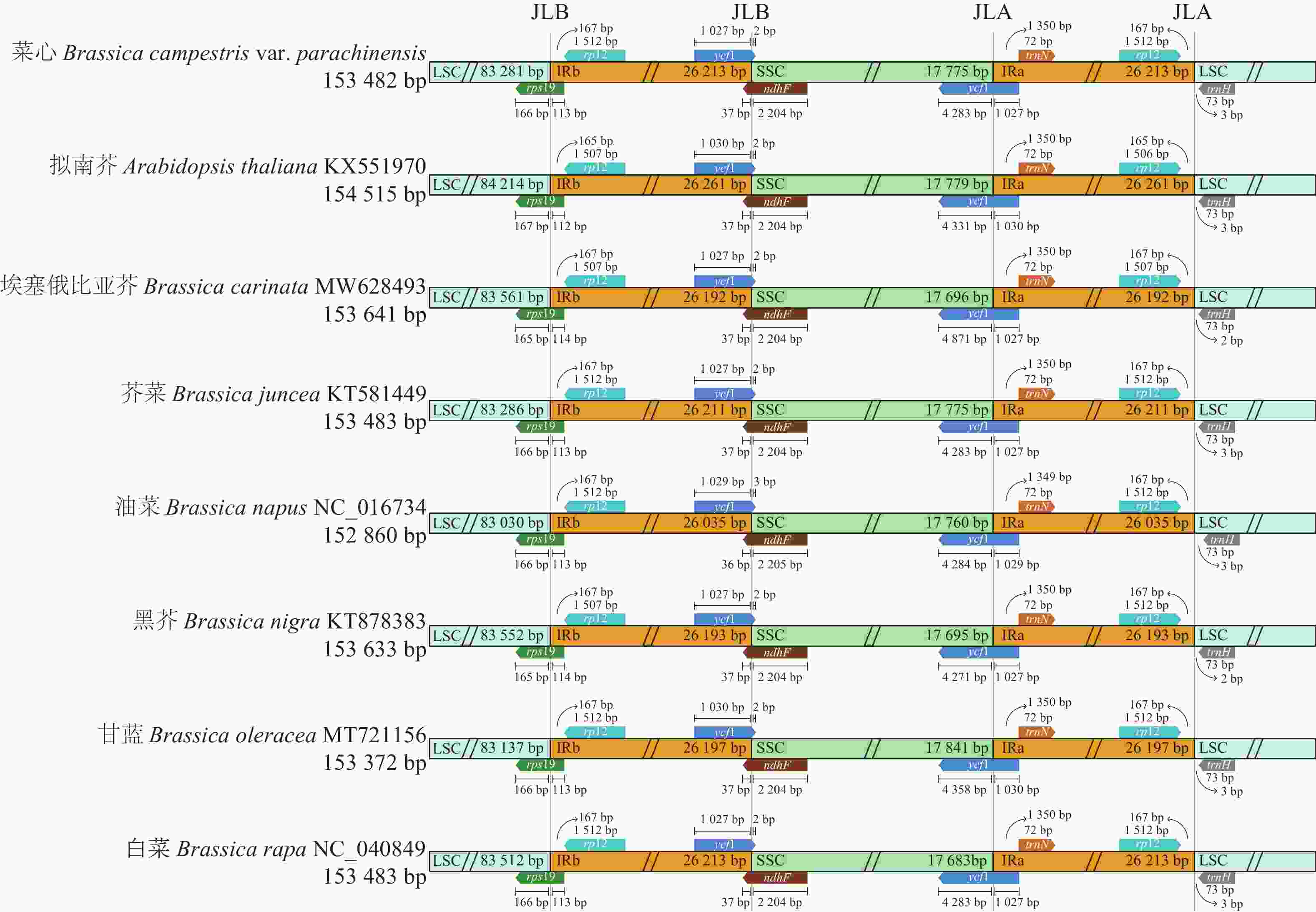 在植物叶绿体基因组的进化过程中,导致其大小差异的主要因素是IR边界的扩张与收缩。边界分析结果表明:菜心等8种十字花科植物的叶绿体基因组均存在4个边界,即JLB (LSC/IRb)、JSB (IRb/SSC)、JSA (SSC/IRa)、JLA (IRa/LSC)。rps19、rpl2、ycf1、ndhFtrnNtrnH是位于IR边界附近的主要基因。在这8种十字花科植物中,JLB边界均位于rps19基因编码区内,且在不同植物叶绿体基因组中仅存在1~2 bp的位置差异;JSB边界均位于ycf1和ndhF基因编码区内,两者有36~37 bp的重叠区域,其中ycf1基因的大部分区域位于IRb,只有2~3 bp位于SSC;JSA边界均位于ycf1基因编码区内,其中 1027 ~ 1030 bp位于IRa,4 271~4 358 bp位于SSC;trnH-GUG均位于LSC,距离JLA边界2~30 bp (图4)。以上结果显示菜心等8种十字花科植物叶绿体基因组高度保守,IR边界总体变化幅度较小,仅涉及少数基因。
