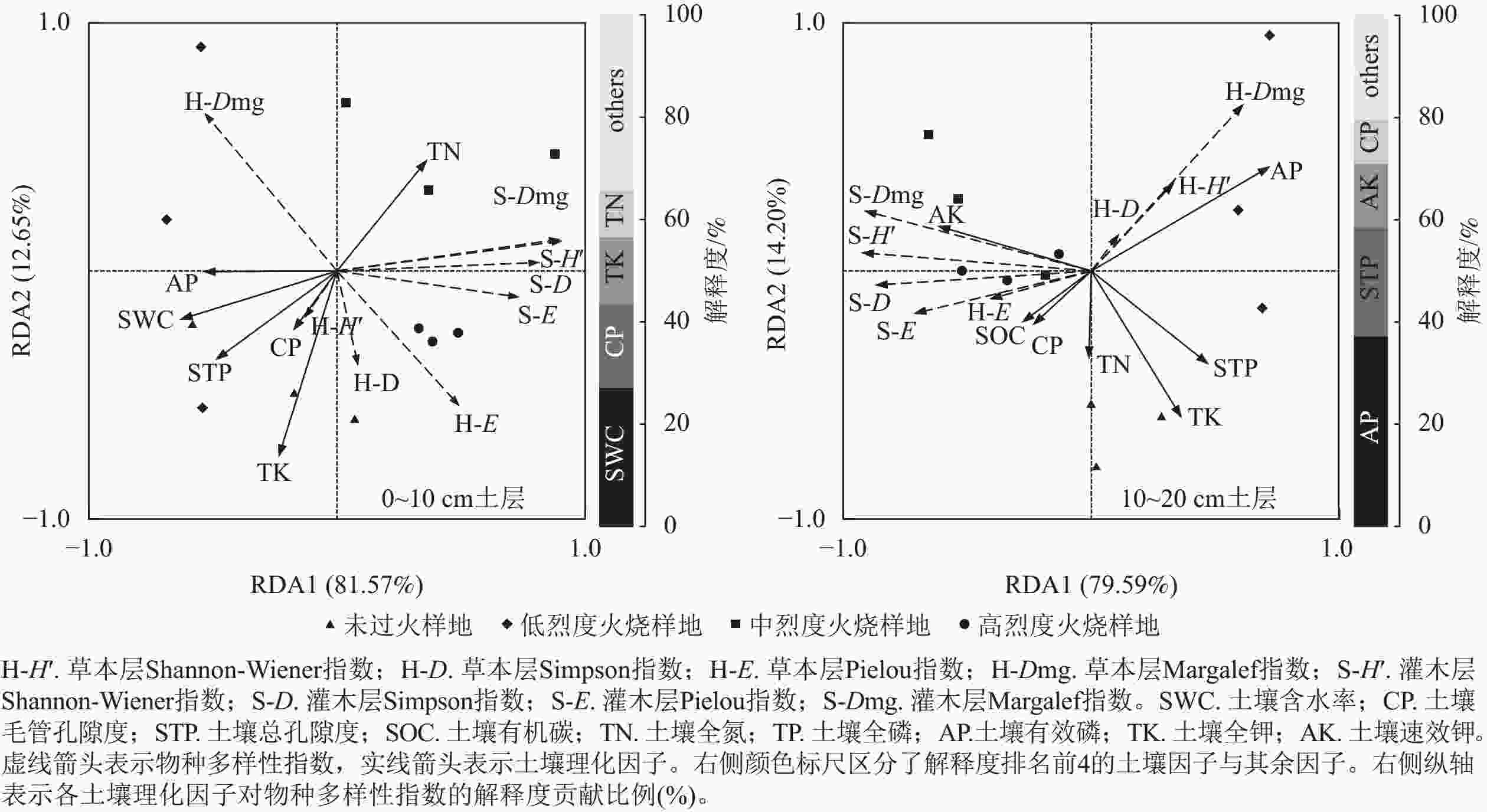 • 火后植被恢复影响着土壤的发育,土壤物理结构及化学性质的变化又一定程度影响群落物种多样性[10]。本研究冗余分析表明:0~10 cm土层的土壤含水率、毛管孔隙度、全钾和10~20 cm土层的土壤有效磷、总孔隙度、速效钾能够更好地解释灌木层、草本层物种多样性差异。在灌木层、草本层,适宜的土壤含水率有助于植物的生长和物种多样性的维持。此外,土壤的通气性和排水性对于植物根系的生长至关重要,良好的土壤结构能够促进根系的扩展并提高根系氧气的供应水平,进而影响植物的生长和物种多样性。钾和磷在植物的生长过程中起着至关重要的作用[48]。钾是植物生长的必需元素,土壤钾质量分数增长可促进植物的生长发育,使物种多样性提升[11],磷则是植物能量传递和根系发育的重要元素。灌木和草本植物对土壤的需求有所不同,草本植物往往更依赖表层土壤中的水分和速效养分,灌木植物具有更深的根系,能够从较深的土层中获取养分。林火对群落物种多样性和土壤性质的影响以及物种多样性和土壤理化性质之间的关系是一个长期、复杂的生态过程,其复杂反馈机制需要进一步探讨。