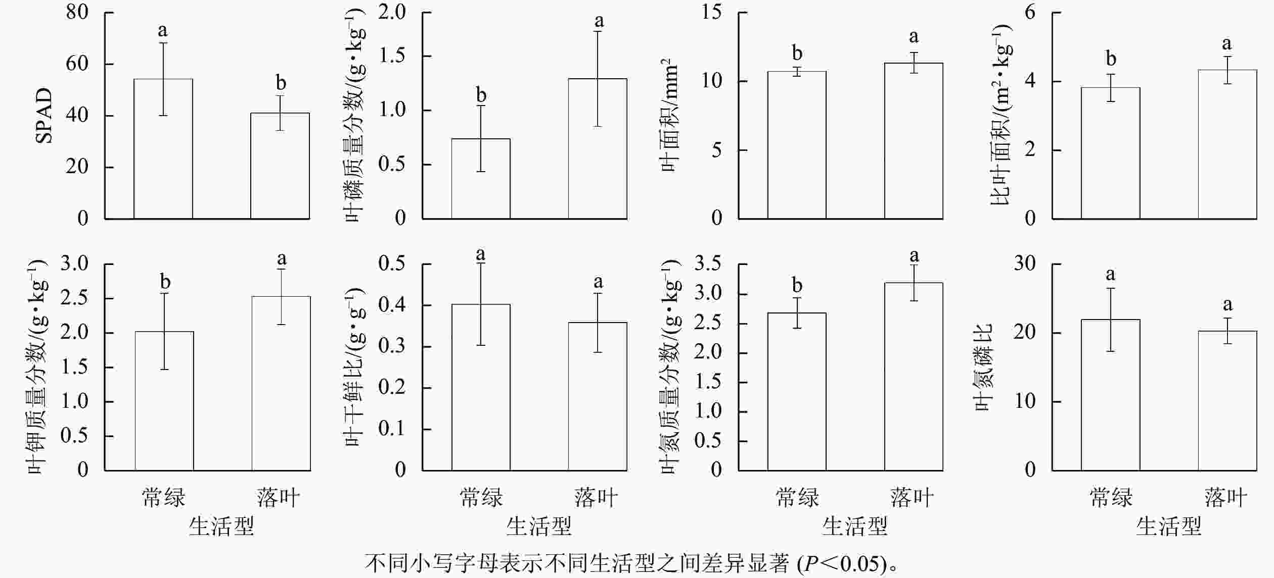 由图1可知:常绿树种的SPAD显著高于落叶树种(41.12)(P<0.05);落叶树种的叶氮、磷、钾质量分数均分别显著高于常绿树种(P<0.05);落叶树种的叶面积和比叶面积均分别显著高于常绿树种(P<0.05),而常绿树种和落叶树种的平均干鲜比与氮磷比之间均无显著差异。可见,常绿树种的叶片具有较低氮、磷、钾质量分数及较小的叶面积与比叶面积,还具有较高的叶绿素含量。