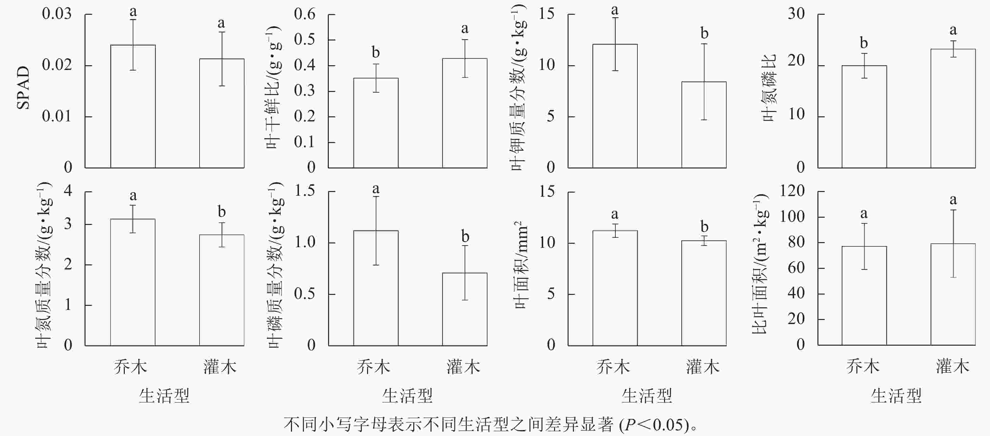 由图2可知,乔木树种与灌木树种的SPAD与比叶面积无显著差异。乔木树种的叶面积以及叶氮、磷、钾质量分数均分别显著大于灌木树种(P<0.05)。此外,灌木树种叶干鲜比和叶氮磷比均分别显著大于乔木树种(P<0.05)。上述结果表明:乔木树种具有较大的叶面积和氮、磷、钾质量分数,以及较小的干鲜比与氮磷比。说明乔木树种相对于灌木树种更容易从环境中获取氮、磷、钾等资源,在与灌木树种的竞争中处于绝对优势。与此相反,灌木树种叶片具有较大的干鲜比与氮磷比,表明灌木树种在有限资源下更注重保障自身生长发育,在叶片中合成更多的有机物。