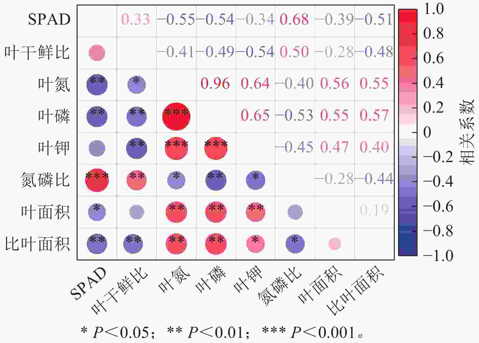 由图3可知:叶氮、磷质量分数与钾质量分数均呈显著正相关(P<0.05) ,而叶氮磷比与氮、磷、钾质量分数均呈显著负相关(P<0.05)。这表明叶氮、磷、钾元素在植物生长过程中具有协调作用。另外,叶SPAD与叶氮磷比呈显著正相关(P<0.05) ,而与叶氮、磷质量分数均呈负相关(P<0.05) ;叶面积与比叶面积均分别与叶氮、磷、钾质量分数呈正相关(P<0.05),而分别与叶SPAD、干鲜比、氮磷比呈负相关(P<0.05)。表明植物通过增加叶干物质质量和叶面积的方式,增加光合速率,提高其对于环境中氮、磷、钾元素的吸收效率。