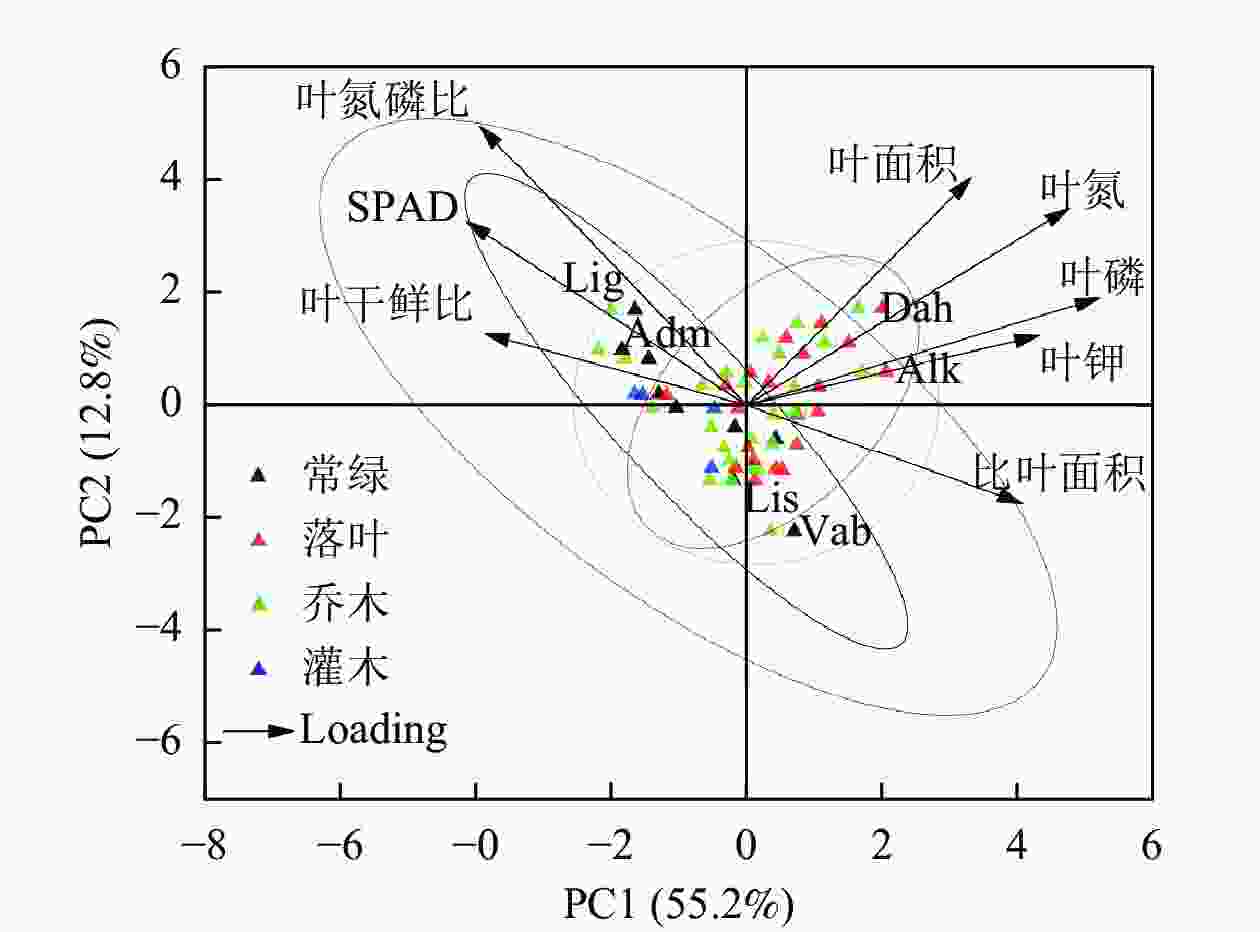 在本研究中,常绿物种的叶钾质量分数低于落叶物种,这可能是因为钾元素在落叶植物体内不形成化合物,始终以离子游离状态存在,通常不断地向代谢旺盛的部位转移,间接反映了该地区落叶树种的叶片代谢可能较常绿乔木更为旺盛[21]。此外,本研究发现:落叶树种的比叶面积高于常绿树种,这可能是由于落叶树种叶片寿命较短,仅在生长期内进行光合作用,与已有研究结果一致[22]。落叶树种需要采取提高潜在回报能力、降低叶片构造成本的策略来最大程度提供光合产物,从而导致落叶树种相较于常绿树种有较高的光合速率和较高的比叶面积。本研究还发现:灌木为了在有限的光照条件下生存,表现出相对较低的叶氮、叶磷、叶钾质量分数,以及较高的叶干鲜比和氮磷比,与相关研究结论一致[23]。