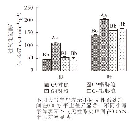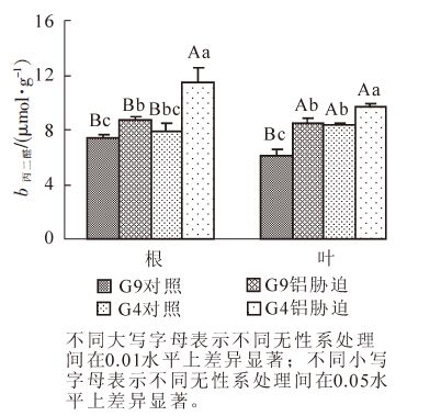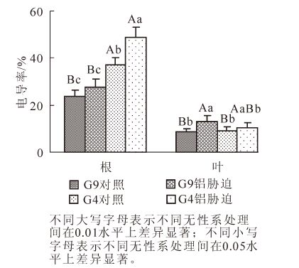 为了阐明不同桉树无性系对铝的抗逆性生理响应机制,采用室内水培法,以广西区2个桉树无性系耐铝型巨尾桉9号Eucalyptus grandis×E.urophylla No.9(记为G9)和铝敏感型尾叶桉4号E.urophylla No.4(记为G4)为研究对象,在4.4 mmol·L-1铝离子浓度下处理24 h(以pH 4.0,0.5 mmol·L-1氯化钙为对照),从根系及叶片内细胞膜透性(CMP),丙二醛(MDA)质量摩尔浓度及过氧化氢酶(CAT),多酚氧化酶(PPO),超氧化物歧化酶(SOD),抗坏血酸过氧化物酶(APX)和谷胱甘肽还原酶(GR)等抗氧化酶活性方面探讨了铝胁迫下供试苗木的耐铝机制。采用SPSS 21.0软件分别对根和叶中G9和G4的各测定指标进行单因素方差分析和Duncan多重比较。根细胞膜透性、丙二醛质量摩尔浓度均显著(P<0.05)高于叶,铝对2个桉树无性系苗木的毒害主要表现在根部。在4.4 mmol·L-1铝离子处理下,G4根相对电导率与丙二醛质量摩尔浓度最高,分别为48.8%,11.5 μmol·g-1,而G9根内过氧化氢酶、抗坏血酸过氧化物酶、谷胱甘肽还原酶活性极显著(P<0.01)大于G4,且G9根过氧化氢酶活性比相应对照增加145.0%,G4根过氧化氢酶活性比相应对照仅增加43.0%,过氧化氢酶在G9根中对铝毒害的缓解起到了更为重要的作用。G9清除活性氧能力较G4强,表明耐铝型桉树对铝毒害具有较好的适应能力。图7参28
