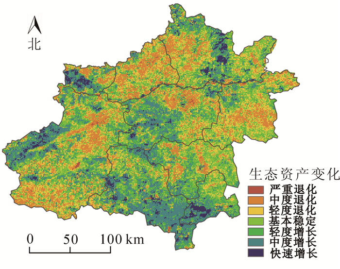 基于遥感中分辨率成像光谱仪(MODIS)的植被指数(NDVI)、植被净初级生产力(NPP)产品数据和土地利用数据以及其他辅助数据,采用遥感定量模型评估了中原城市群区域在2000,2005,2010和2015年4个时期的生态资产价值,分析生态资产的格局变化及驱动因素。结果表明:①中原城市群生态资产空间分布不均衡,西南部的洛阳和平顶山生态资产价值占到全区的51.88%,东北部及中部的新乡和郑州占到全区的21.02%;空间上表现为以郑州为中心,高值区沿西南和东北方向发展、低值区沿西北和东南方向发展的“两线”发展态势。②生态资产价值表现为连年减少(-2.17亿元·a-1),单位面积生态资产总体上变化不大。空间分布上,郑州及以西区域(洛阳、焦作、济源)显著下滑,以东区域略有增长。③受土地利用方式变化、经济和人口增长的影响,区域内林地、耕地、草地面积缩减造成相应生态资产流失(46.62,8.81和2.52亿元),使得人均生态资产价值下降(13.4%)。由此认为,区域经济的快速增长需加强和生态环境之间的协调关系,同时针对不同城市的发展定位和资源特点,优化产业结构,严格用地;加强生态资产核算及生态补偿。