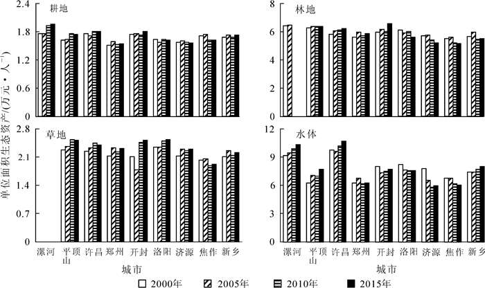 基于遥感中分辨率成像光谱仪(MODIS)的植被指数(NDVI)、植被净初级生产力(NPP)产品数据和土地利用数据以及其他辅助数据,采用遥感定量模型评估了中原城市群区域在2000,2005,2010和2015年4个时期的生态资产价值,分析生态资产的格局变化及驱动因素。结果表明:①中原城市群生态资产空间分布不均衡,西南部的洛阳和平顶山生态资产价值占到全区的51.88%,东北部及中部的新乡和郑州占到全区的21.02%;空间上表现为以郑州为中心,高值区沿西南和东北方向发展、低值区沿西北和东南方向发展的“两线”发展态势。②生态资产价值表现为连年减少(-2.17亿元·a-1),单位面积生态资产总体上变化不大。空间分布上,郑州及以西区域(洛阳、焦作、济源)显著下滑,以东区域略有增长。③受土地利用方式变化、经济和人口增长的影响,区域内林地、耕地、草地面积缩减造成相应生态资产流失(46.62,8.81和2.52亿元),使得人均生态资产价值下降(13.4%)。由此认为,区域经济的快速增长需加强和生态环境之间的协调关系,同时针对不同城市的发展定位和资源特点,优化产业结构,严格用地;加强生态资产核算及生态补偿。图 4 表 4 参26