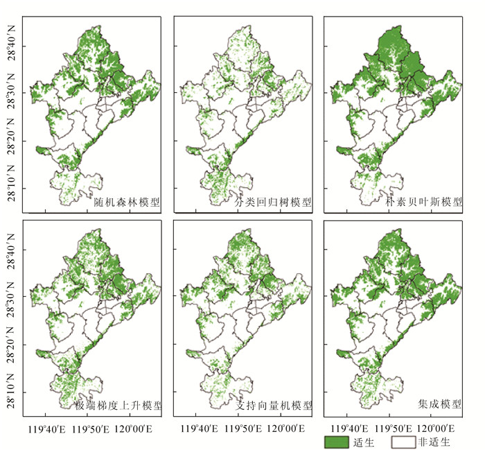 研究使用R软件中的CaretEnsemble和Caret程序包,并基于Stacking方法来实现模型集成,研究南方红豆杉Taxus chinensis var.mairei在浙江省丽水市莲都区的潜在分布区,并比较5种单一模型的模拟结果及其与集成模型的差异。结果表明:单一模型中极端梯度上升模型表现最好,其次是随机森林模型、支持向量机模型、朴素贝叶斯模型和分类回归树模型,集成模型模拟结果好于单一模型,其Kappa值达0.80,准确率达0.90。集成模型模拟结果显示:影响南方红豆杉分布的主要环境因子为海拔、归一化植被指数和年平均最少降雨量。南方红豆杉主要适宜生长在浙江省丽水市莲都区的山地丘陵地区,中部盆地及平原地区不适宜南方红豆杉的生长,其在莲都区的潜在分布区面积为5.01万hm2。构建的集成模型在一定程度上提高了模型精度,使预测效果更优。