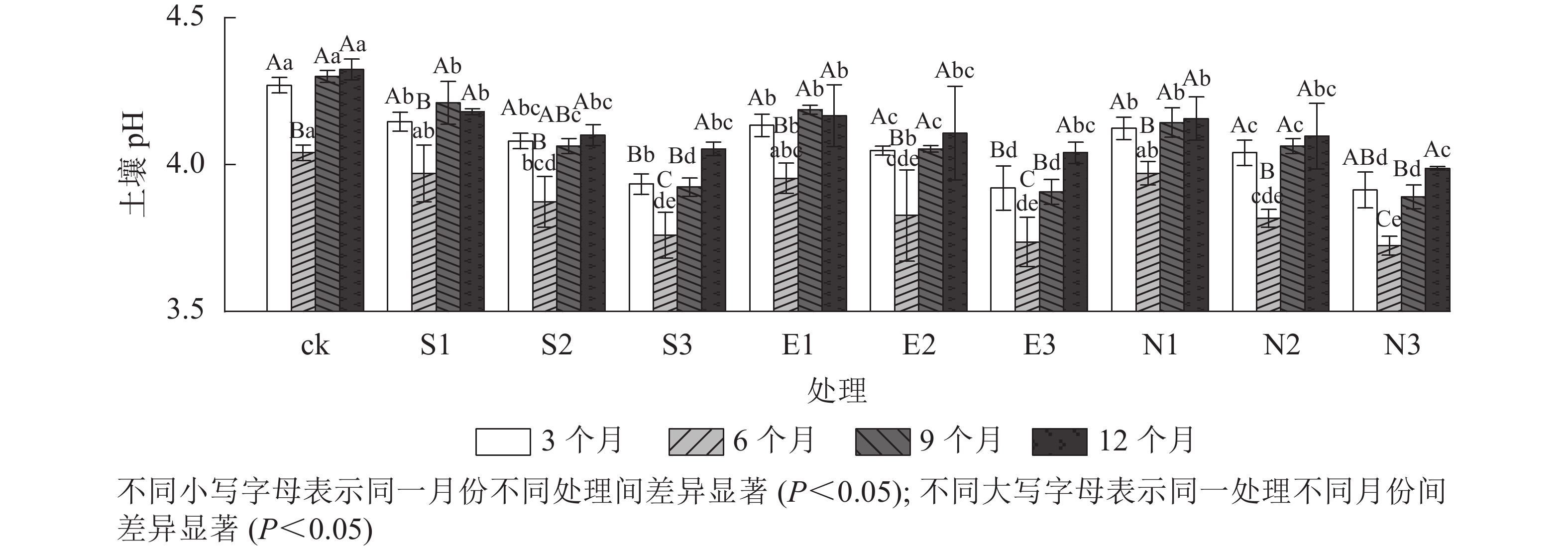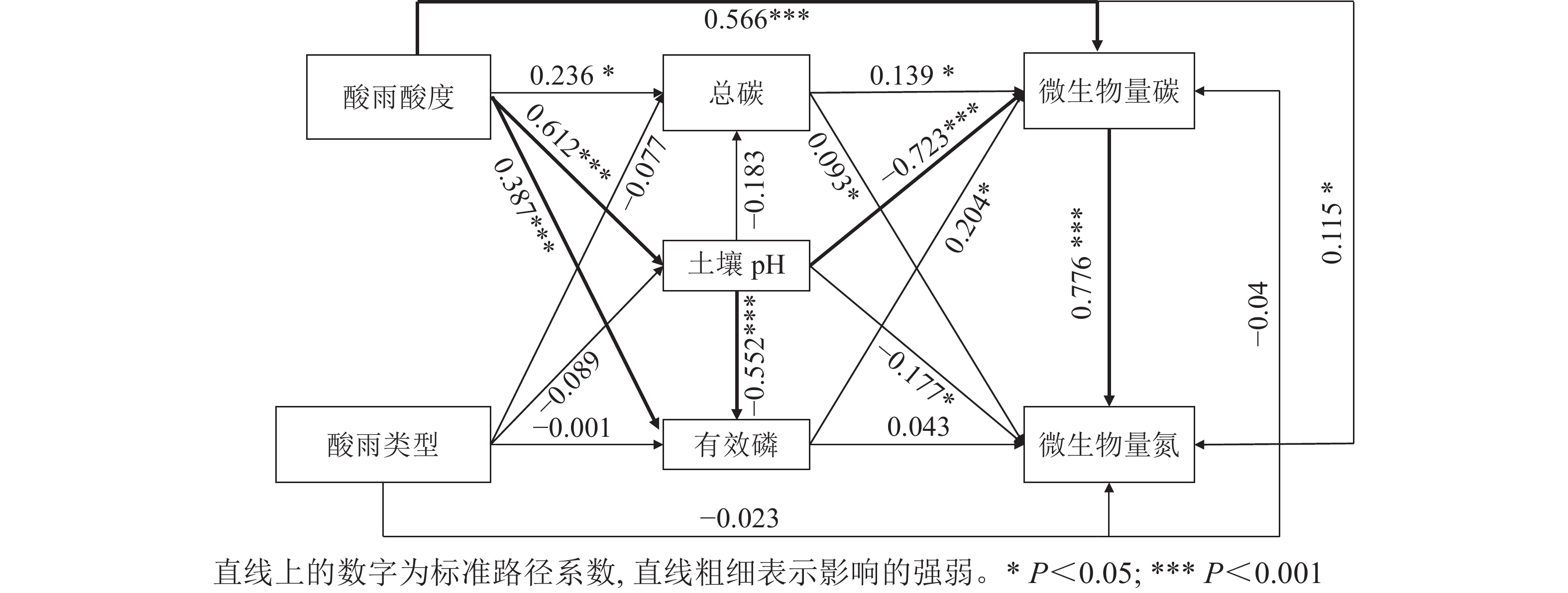 目的 探究酸雨类型转变对杉木Cunninghamia lanceolata林土壤养分及微生物量碳氮的影响,为不同类型酸雨区杉木人工林可持续经营提供理论依据。 方法 以南京市东善桥林场杉木人工林为研究对象,在对照处理(ck,山间防火池水,pH 6.6)、不同酸雨类型[包括酸雨类型(硫酸型、硝酸型和混合型)和酸雨酸度(模拟溶液pH 4.5、3.5和2.5)]胁迫1 a后,探究酸雨类型转变对杉木林土壤养分及微生物的影响。 结果 随着酸雨酸度增加,不同类型酸雨处理土壤pH呈显著下降趋势(P<0.05),而土壤交换性氢离子(H+)和铝离子(Al3+)呈显著上升趋势(P<0.05);与对照相比,酸雨pH为2.5时,土壤交换性H+、Al3+均在硫酸型酸雨处理下分别增长了275%和240%,在混合型酸雨处理下分别增长了254%和246%,在硝酸型酸雨处理下分别增长了246%和249%。此外,酸雨胁迫时间显著影响土壤总碳、总氮、总硫、有效磷和微生物量碳氮(P<0.05),但酸雨类型对土壤微生物量碳氮影响不显著;酸雨胁迫1 a后,pH 2.5硝酸型酸雨处理下土壤微生物量碳氮质量分数最低,分别为(378.89±60.69)和(38.67±4.10) mg·kg−1。通过结构方程模型可知:酸雨酸度对杉木林土壤微生物量碳氮的影响强于酸雨类型,其主要通过影响土壤pH、有效磷和总碳间接影响微生物量碳氮。 结论 1 a的短期酸雨胁迫后,酸雨酸度仍然是影响杉木林土壤特性的主要因子,而酸雨类型转变将会加剧酸雨酸度对杉木林土壤特性的抑制作用。图6表3参29