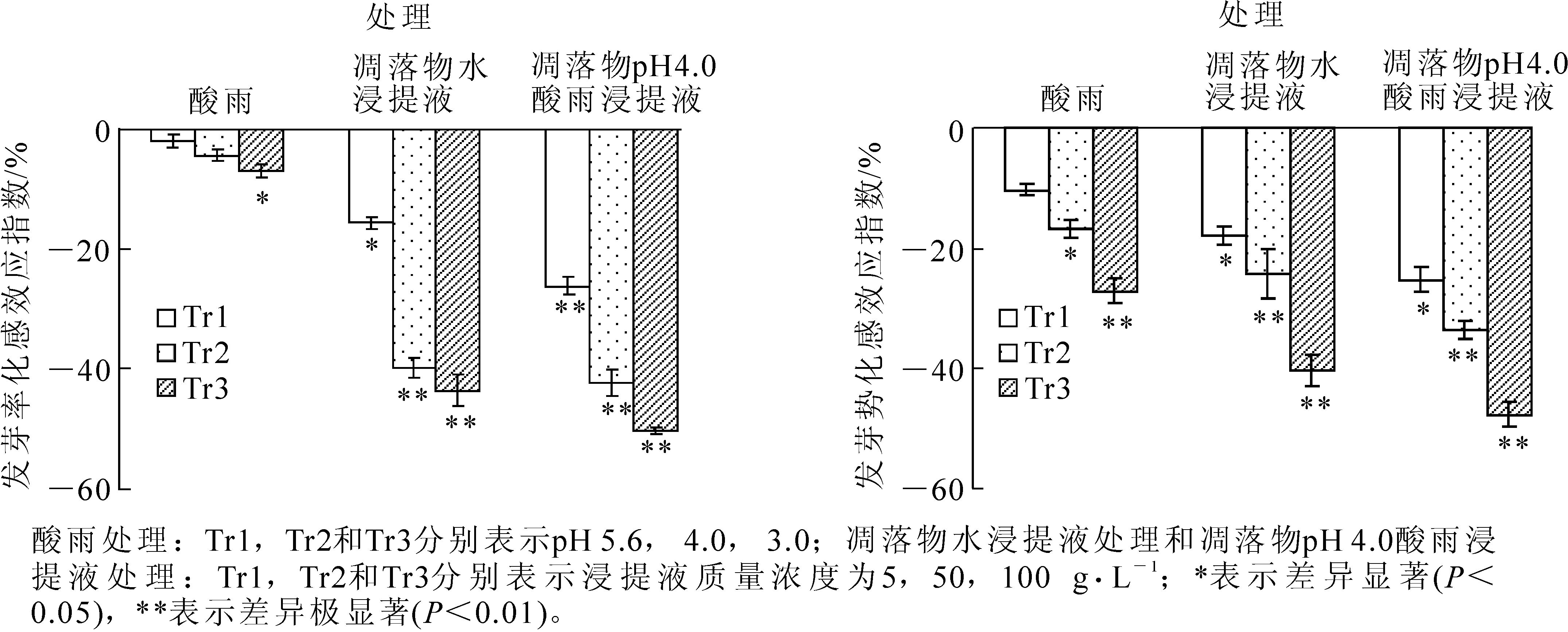 酸雨、凋落物水浸提液和凋落物酸雨浸提液对柳杉种子萌发的影响具有明显差异(图 2)。pH 5.6和 pH 4.0酸雨对柳杉种子萌发无显著影响,pH 3.0酸雨处理显著降低柳杉种子发芽率(P<0.05),与对照相比降低了6.9%;5 g·L-1凋落物水浸提液处理显著降低柳杉种子发芽率(P<0.05),比对照降低了15.6%,且随着浸提液质量浓度的增大对柳杉种子发芽率的抑制作用加强;5 g·L-1酸雨浸提液处理极显著降低柳杉种子发芽率(P<0.01),与对照相比降低了26.3%;pH 5.6酸雨处理对柳杉种子发芽势无显著影响,pH 4.0酸雨处理显著降低柳杉种子发芽势(P<0.05),与对照相比降低了16.8%。5 g·L-1凋落物水浸提液和凋落物酸雨浸提液处理均显著降低柳杉种子发芽势(P<0.05),分别比对照降低了17.8%和25.2%,且随着浸提液质量浓度的增大对柳杉种子发芽势的抑制作用加强。