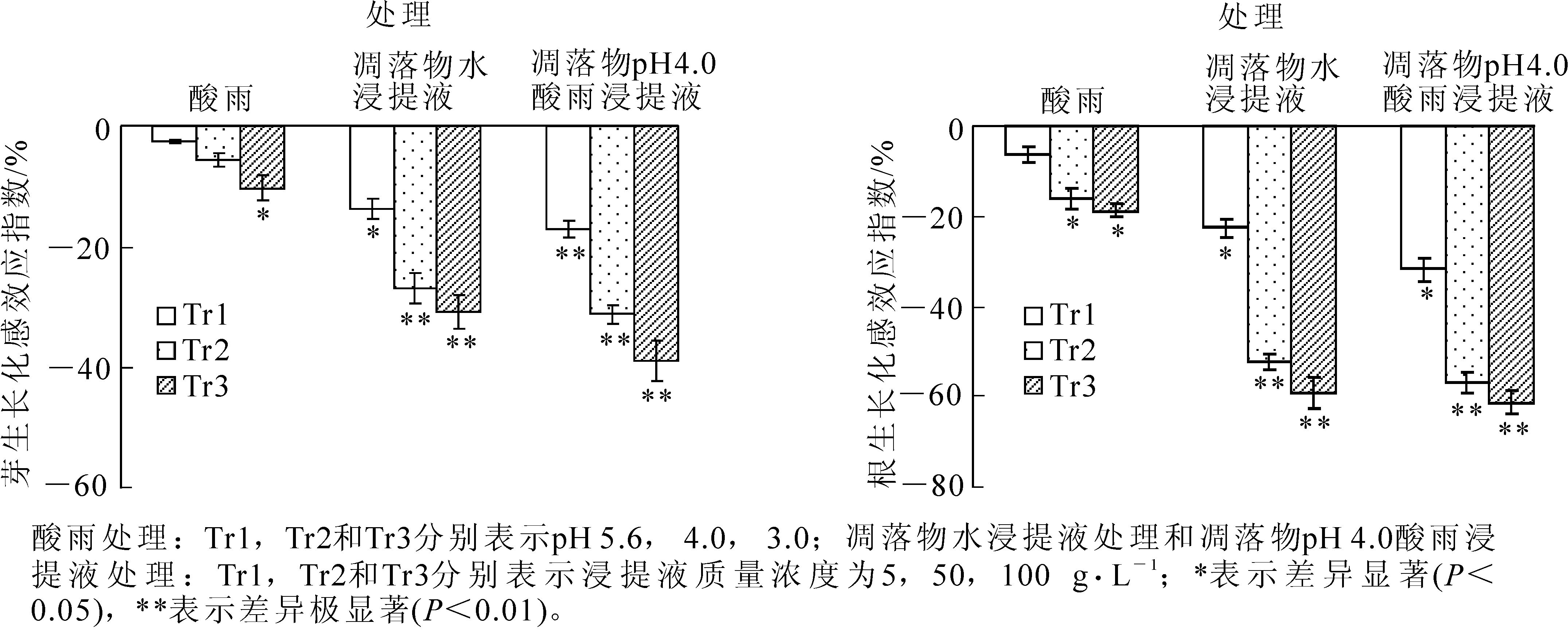 pH 5.6和 pH 4.0酸雨处理对柳杉幼苗芽生长无显著影响,pH 3.0显著抑制柳杉幼苗芽生长(P<0.05),与对照相比降低了10.2%(图 3);5 g·L-1凋落物水浸提液处理显著抑制柳杉幼苗芽生长(P<0.05),与对照相比降低了13.7%;5 g·L-1酸雨浸提液处理极显著抑制柳杉幼苗芽生长(P<0.01),与对照相比降低了17.1%。pH 5.6酸雨处理对柳杉幼苗根生长影响不显著,pH 4.0和pH 3.0酸雨处理显著抑制柳杉幼苗根生长(P<0.05),分别比对照降低了15.9%和18.8%。5 g·L-1凋落物水浸提液和凋落物酸雨浸提液处理均显著抑制柳杉幼苗根生长(P<0.05),分别比对照降低了22.7%和31.9%,并且随着浸提液质量浓度的增大对柳杉芽和根生长的抑制作用加强。