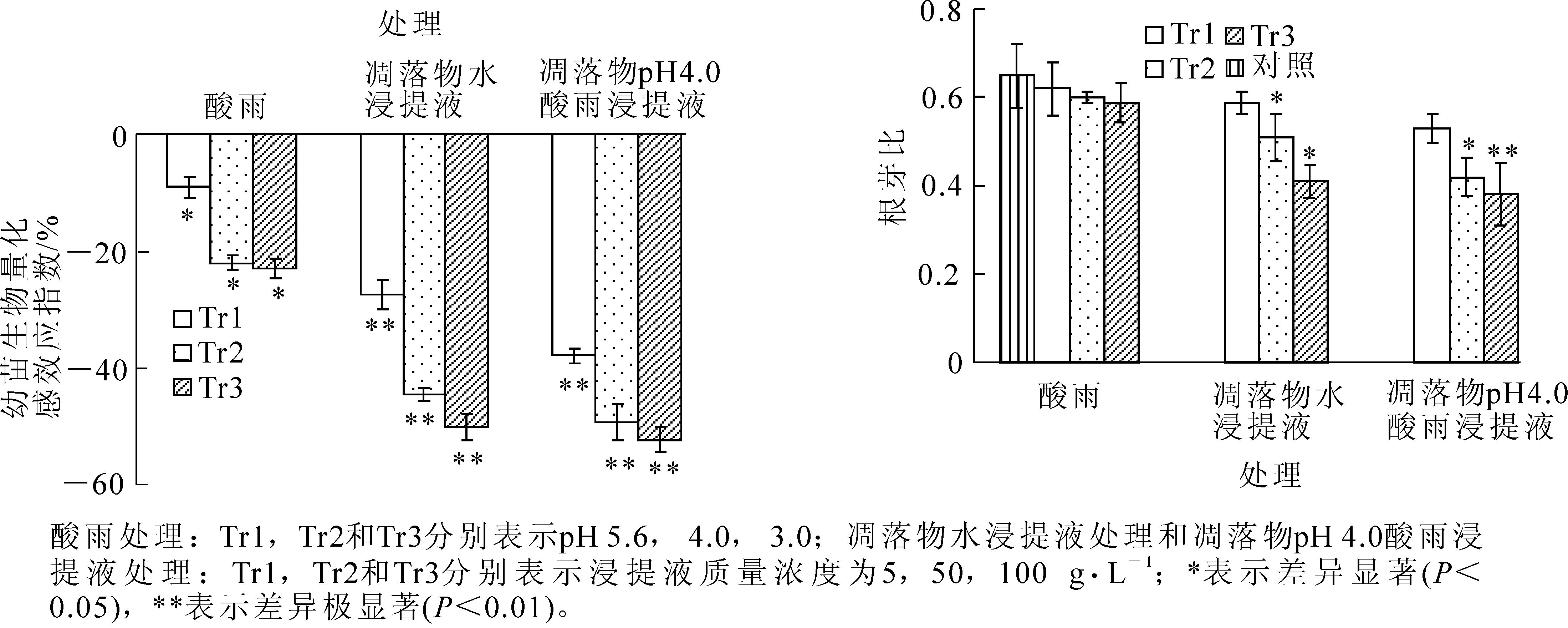 发芽率是反映种子质量优劣的重要指标,而发芽势反映了种子的活力状况。这2个指标是反映环境胁迫对植物种子萌发影响程度的重要指标,而生长指标可以更直观地显示植物幼苗受环境胁迫的程度。大量研究[18-21]表明:酸雨和化感作用对植物种子萌发过程、幼苗和根系的生长发育有抑制作用。本研究结果表明:酸雨和凋落物水浸提液处理使柳杉种子发芽率和发芽势降低,这可能是由于酸雨制约种子储藏物质分解、运输及细胞增殖和新器官的构建[22-24],而柳杉凋落物中的酚酸等化感物质抑制了种子萌发时所需的关键酶类[25-26]。酸雨和凋落物水浸提液处理使柳杉幼苗根生长和芽生长均受到不同程度的抑制作用,降低了柳杉幼苗生物量和根芽比。这可能是由于酸和化感物质抑制种子保护酶的活性,破坏了细胞的正常结构,造成细胞代谢异常,影响了胚的正常发育,加剧植物细胞的质膜过氧化[27-28]。酸雨和凋落物复合作用对柳杉种子发芽率和发芽势以及芽生长、根生长、根芽比和幼苗生物量的抑制效果比酸雨和凋落物水浸提液增强,其原因可能是酸雨增强了凋落物次生代谢物质的释放[29],从而使凋落物化感物质的种类和数量增多。