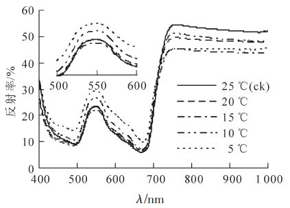 采用光谱分析仪(UniSpec-SC,美国产)测定毛竹叶片在310~1 130 nm处的反射光谱数据,采样间隔1 nm,分辨率1 nm。测定时间为上午10: 00-12: 00,测定毛竹3株·次-1,选取叶子6片·株-1,取其平均值作为该温度的光谱反射率。测量过程中及时进行标准白板校正,用Multispec 5.1数据处理软件读取反射光谱原始数据。