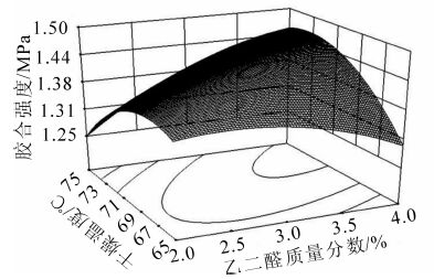 图 1防腐液中乙二醛的质量分数和干燥温度对胶合强度影响的响应曲面