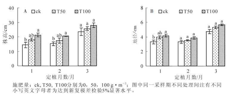 由图 1可知:随着施肥量的增加,普陀樟苗木的株高和地径均增加。可见,增加施肥量促进了普陀樟苗木的高、径生长。从高生长来看(图 1A),T50处理在定植后1,2,3个月分别比对照(ck)增加了25.40%,14.33%和9.48%;T100分别比ck高出48.23%,34.29%和19.39%;T100分别较T50增加了18.20%,17.54%和9.05%。从方差分析的结果来看,T50和ck之间以及T50和T100之间始终没有显著差异。而T100和ck之间,在定植后1个月和2个月,两者差异性达到显著水平(P<0.05),到第3个月时,两者的苗高没有显著差异。从地径变化来看(图 1B),T100处理在定植后1,2,3个月较ck增加,分别达26.06%,16.62%和20.17%;T50增幅分别为19.70%,6.34%和12.95%;T100较T50的增幅分别为5.32%,9.66%和6.39%。方差分析显示,3种处理间在定植后1个月时出现显著差异(P<0.05),之后各处理间差异均不显著。