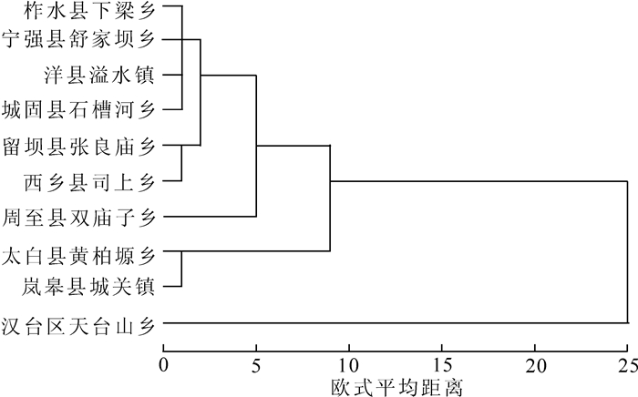 为研究卷丹种群间的相似性及亲缘关系,根据其形态特征的16个数量性状,对10个卷丹野生种群用SPSS 19.0进行聚类分析。结果(图 1)显示:10个卷丹野生种群在阈值为10.0处明显分为2大类,汉台区天台山乡种群单独聚为一类,其余种群聚为一类。此外,性状的表型特征并没有依地理距离而聚类,说明卷丹种群间表型性状变异存在不连续性。