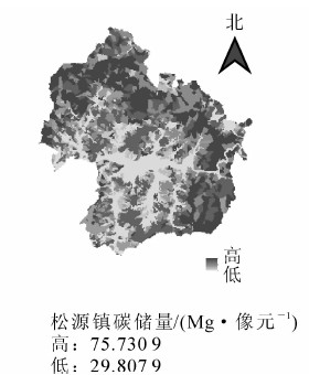 根据研究区2008年的地面调查数据和2009年的遥感数据,利用InVEST模型碳储量模块对研究区的不同尺度区域的碳储量估算结果如下:庆元县的碳储量为3.274 3×107Mg;松源镇的碳储量为2.138 6×106Mg;坑西村的碳储量为1.716 9×105Mg。它们各自的碳储量空间分布如图 2,图 3和图 4所示。
